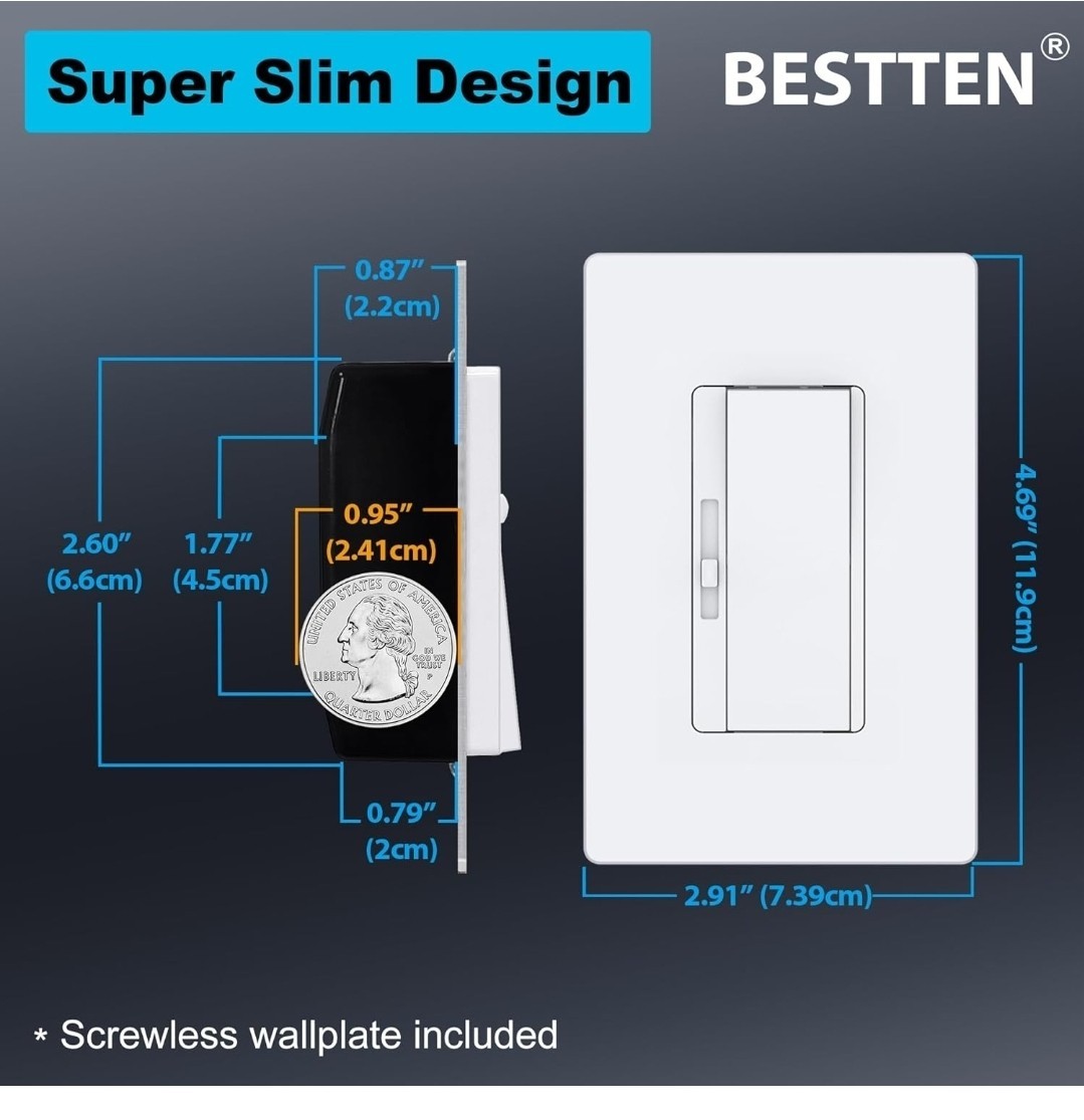 Super Slim Dimmer Light Switch, Quiet Rocker, Single Pole or 3 Way 6 pack
