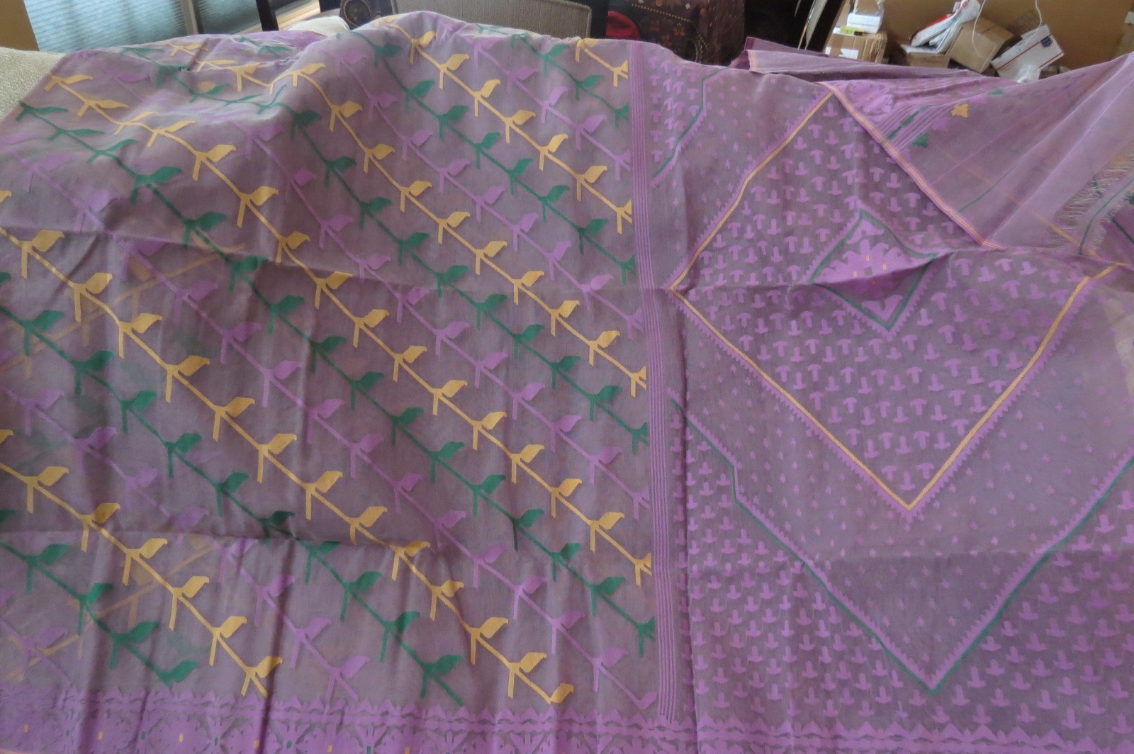 как выглядит Handwoven Jamdani Cotton Saree Purple Base with Yellow, Green Lavender Flora фото