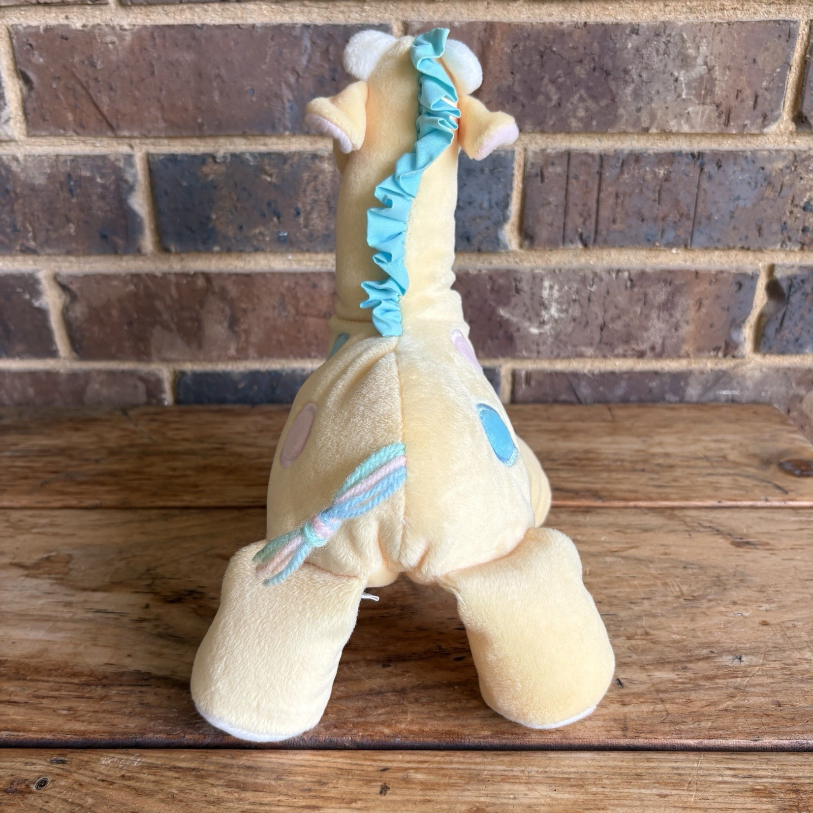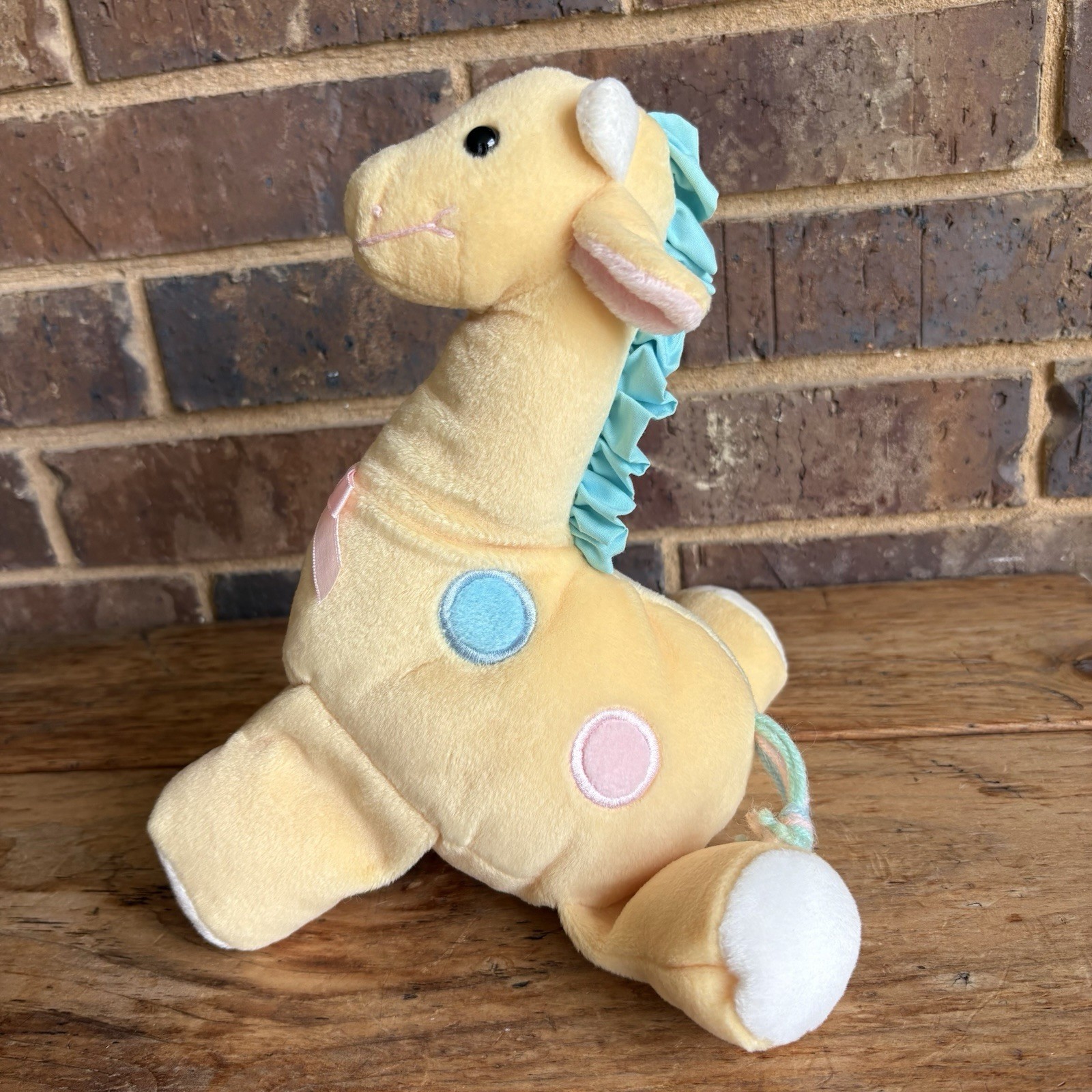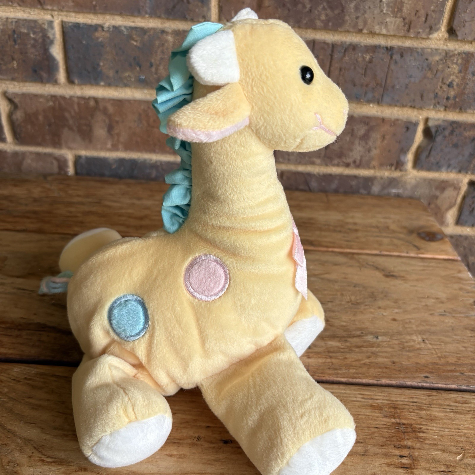 как выглядит Eden Giraffe Plush Baby Yellow w Pink Blue Spots Yarn Tail Vtg Stuffed Animal фото