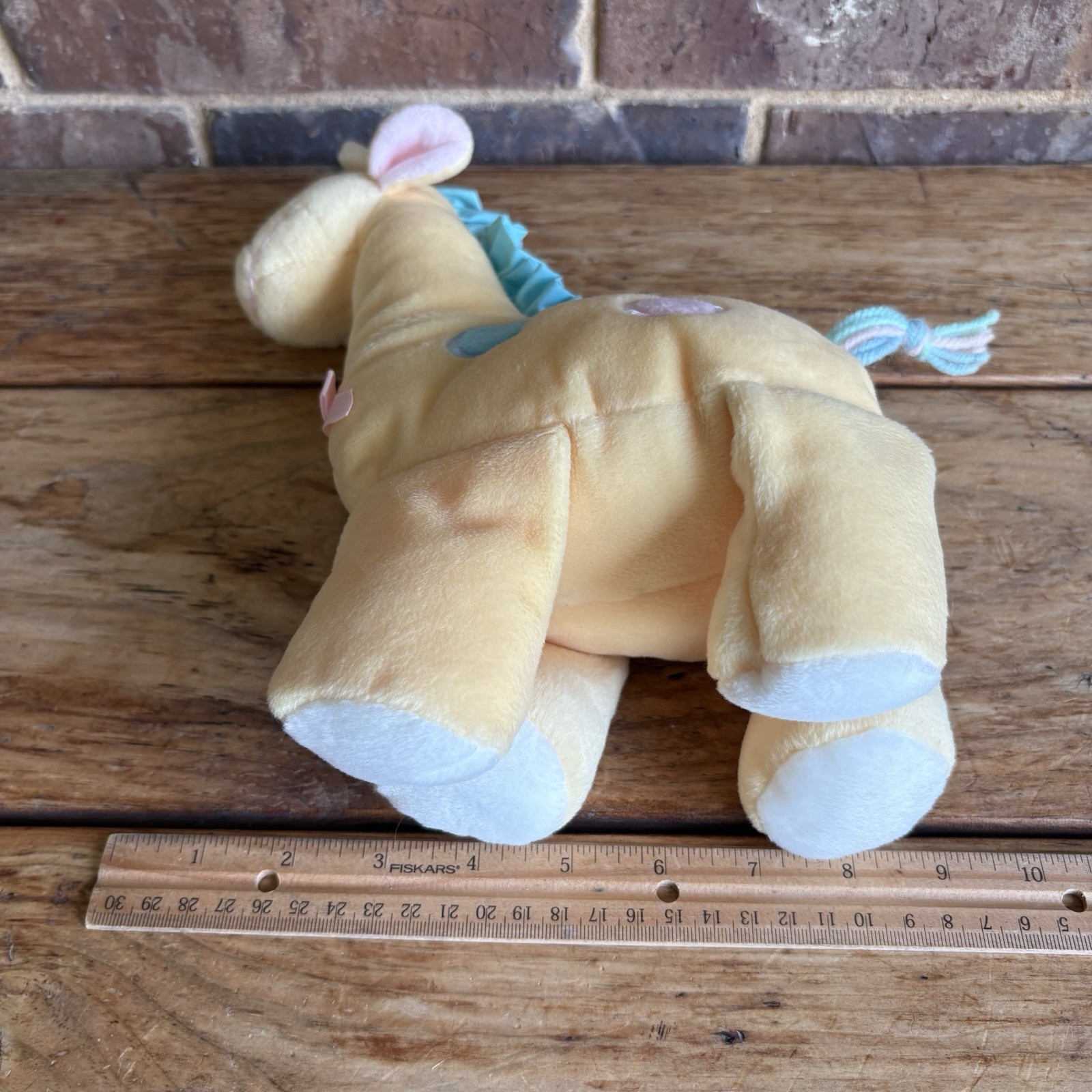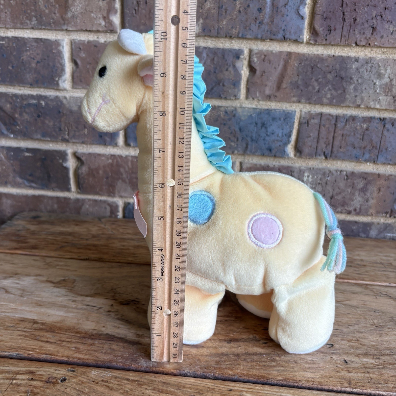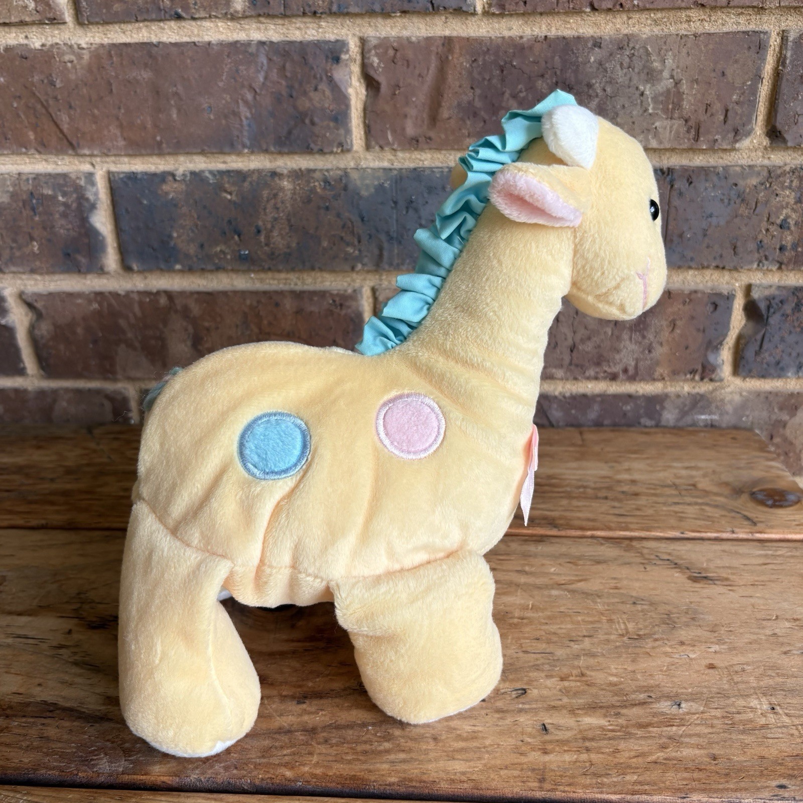 как выглядит Eden Giraffe Plush Baby Yellow w Pink Blue Spots Yarn Tail Vtg Stuffed Animal фото