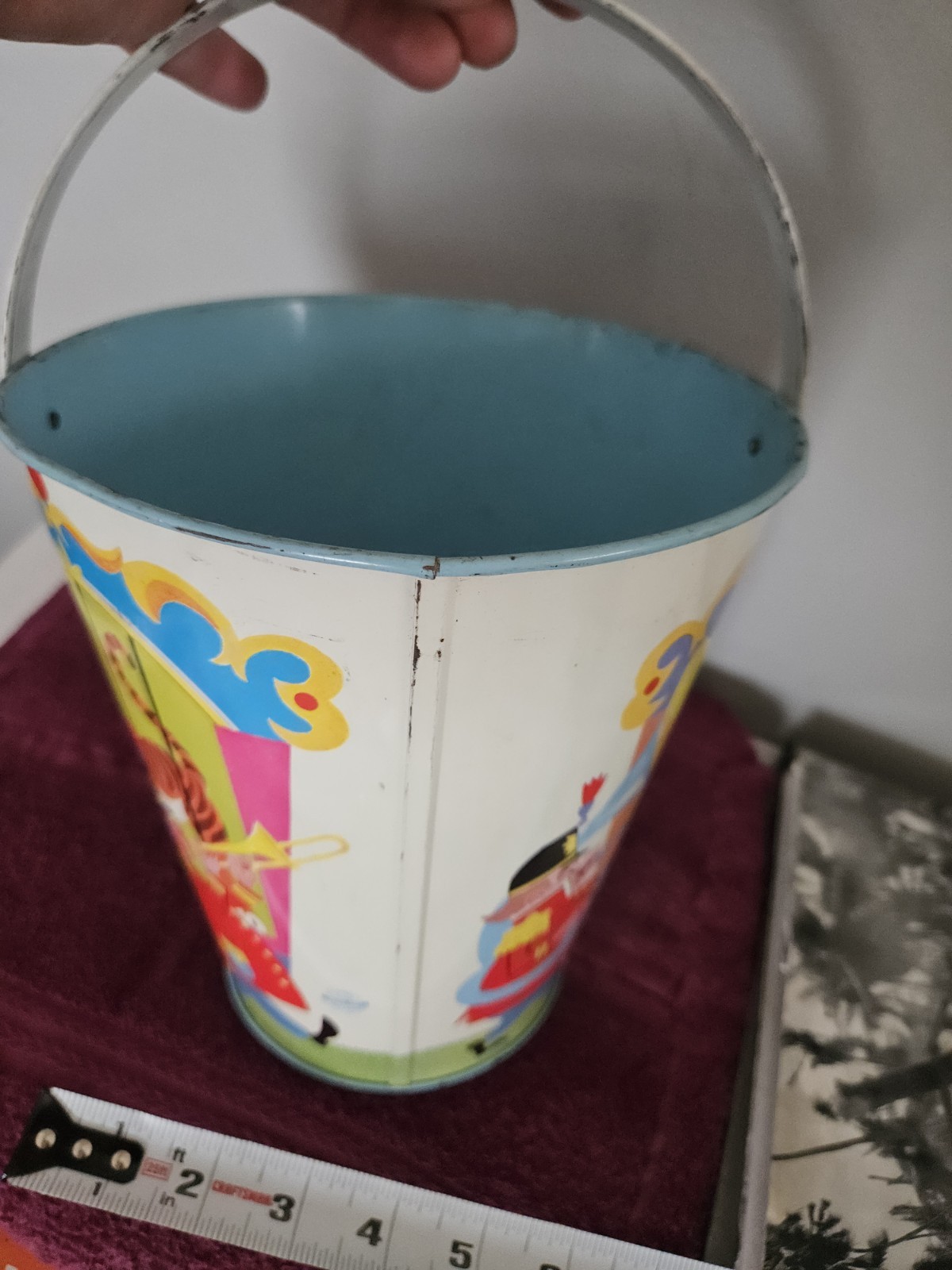 как выглядит 5 Piece Lot Tin Litho Sand Pails Shovel Bucket Vintage Ohio Art J Chein фото