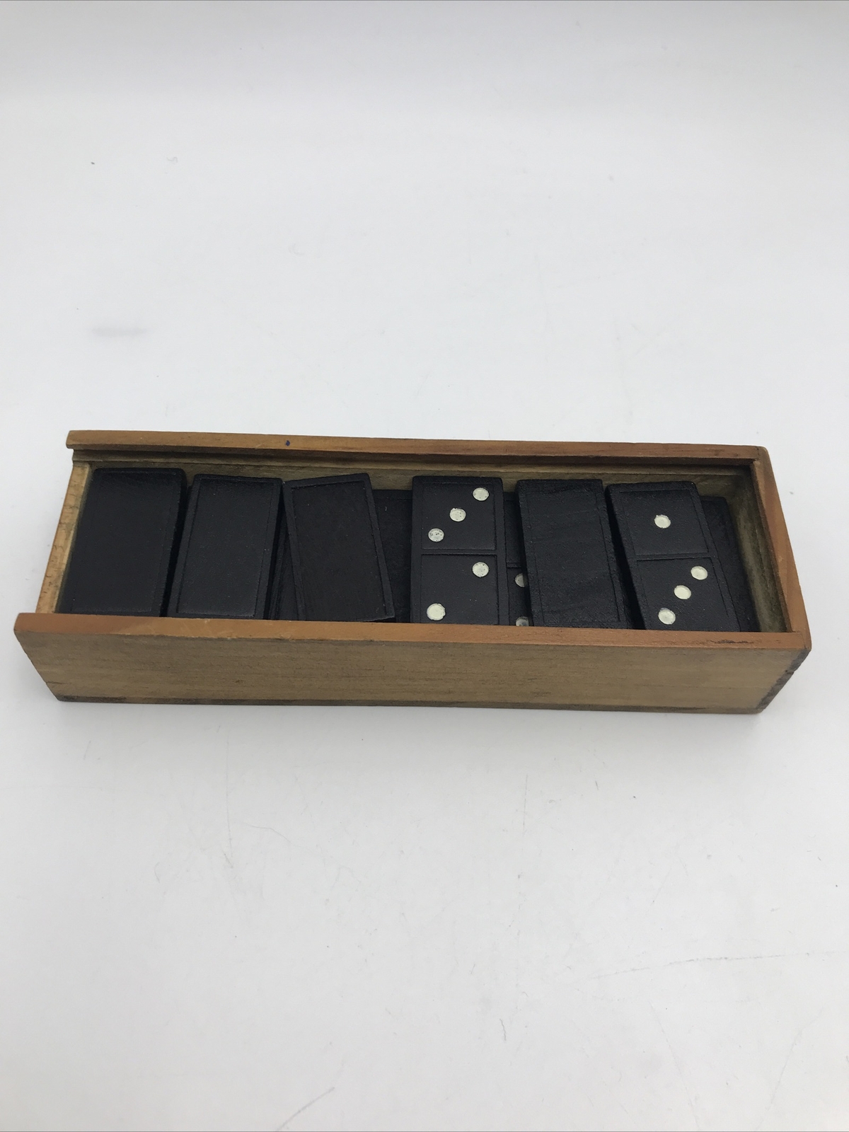 как выглядит Wooden Domino Set 27 Pc in Wooden Slide Open Box Unmarked Tile Game фото