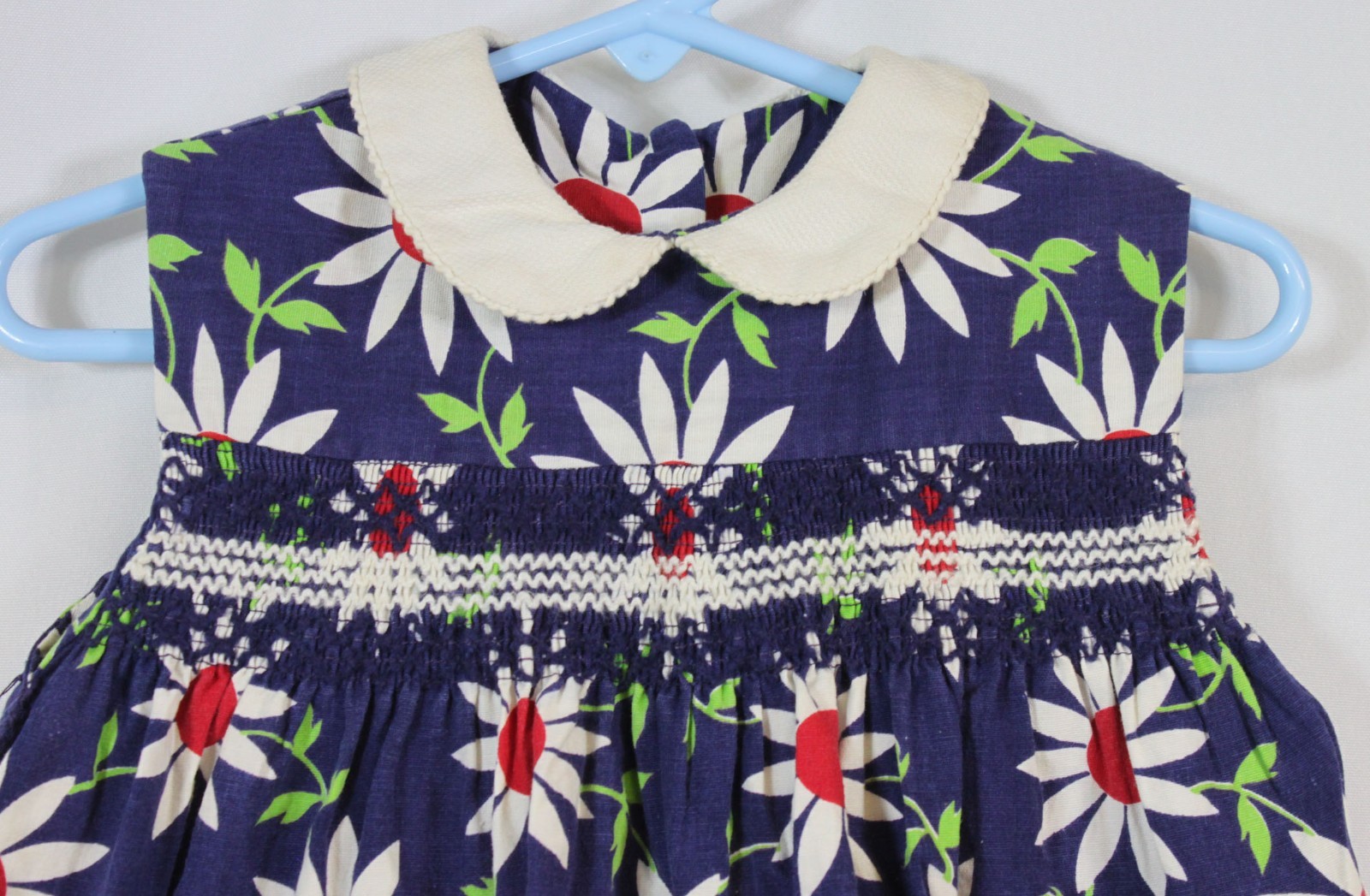 Sweet Vtg Toddler Dress Girls Retro Daisy Flowers Navy White Smocked Retro 2T