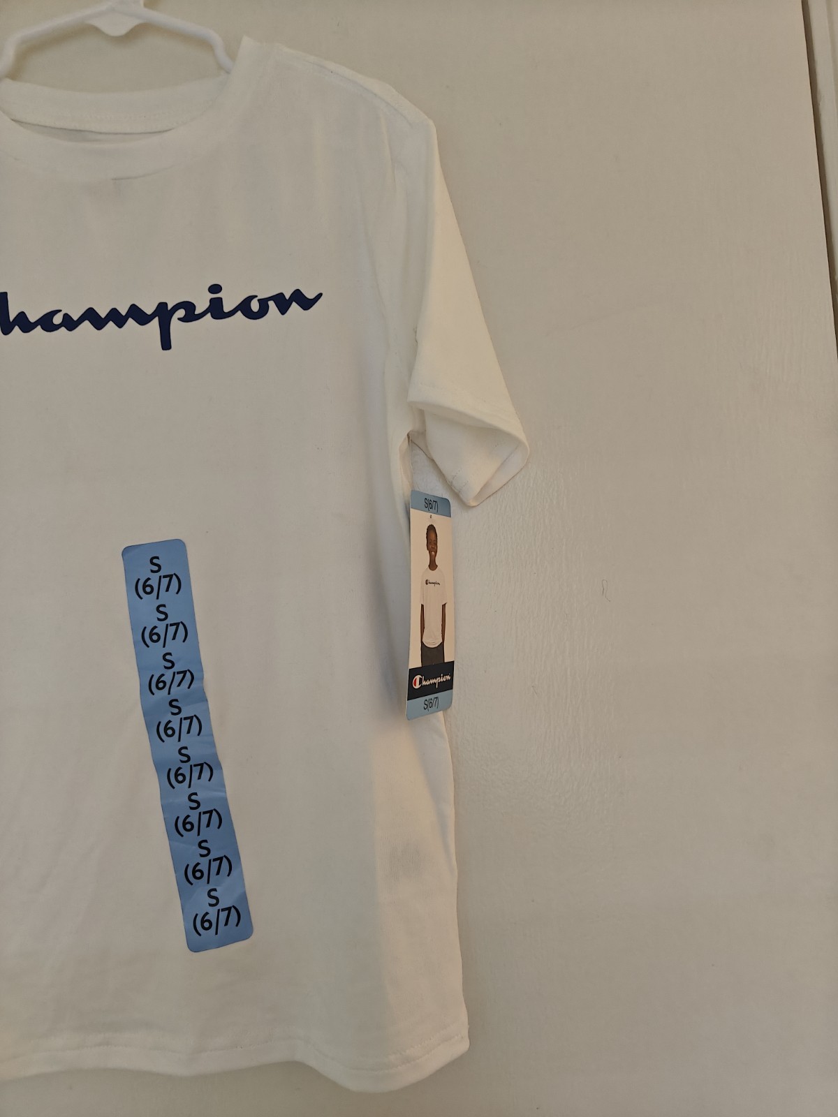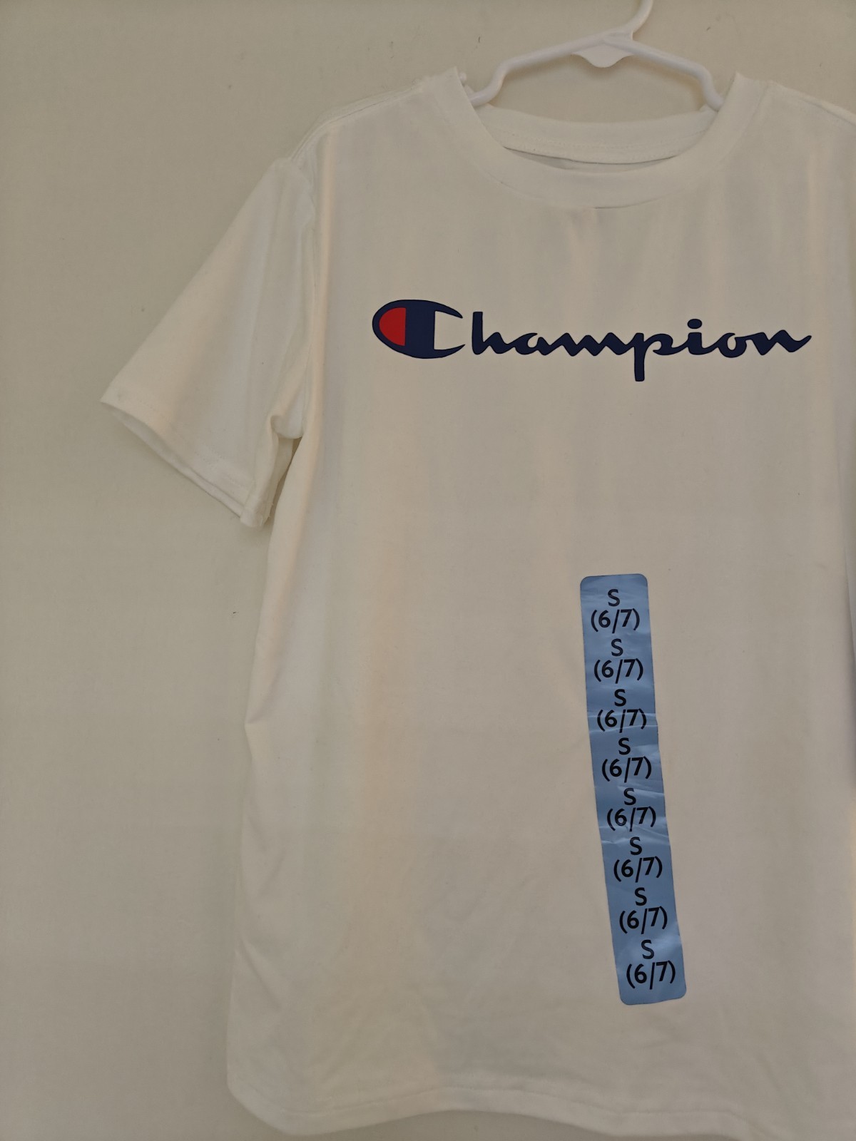 Champion Boy's Pure White With Blue Logo T-shirt Lightweight Size Small 6/7 NWT
