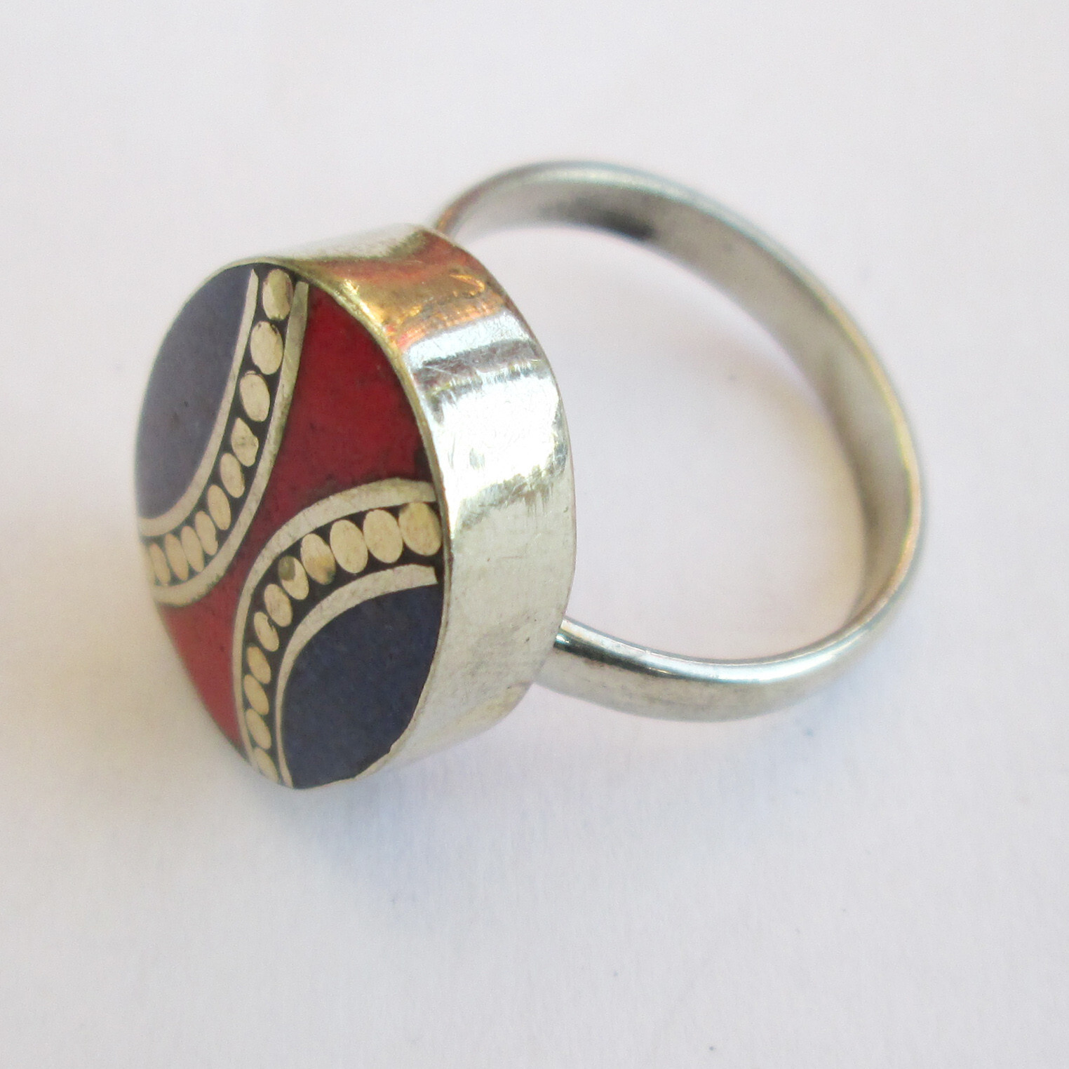 как выглядит Tibetan Silver Coral Blue Lapis Natural Jewelry Adjustable Unisex Ring R14 фото