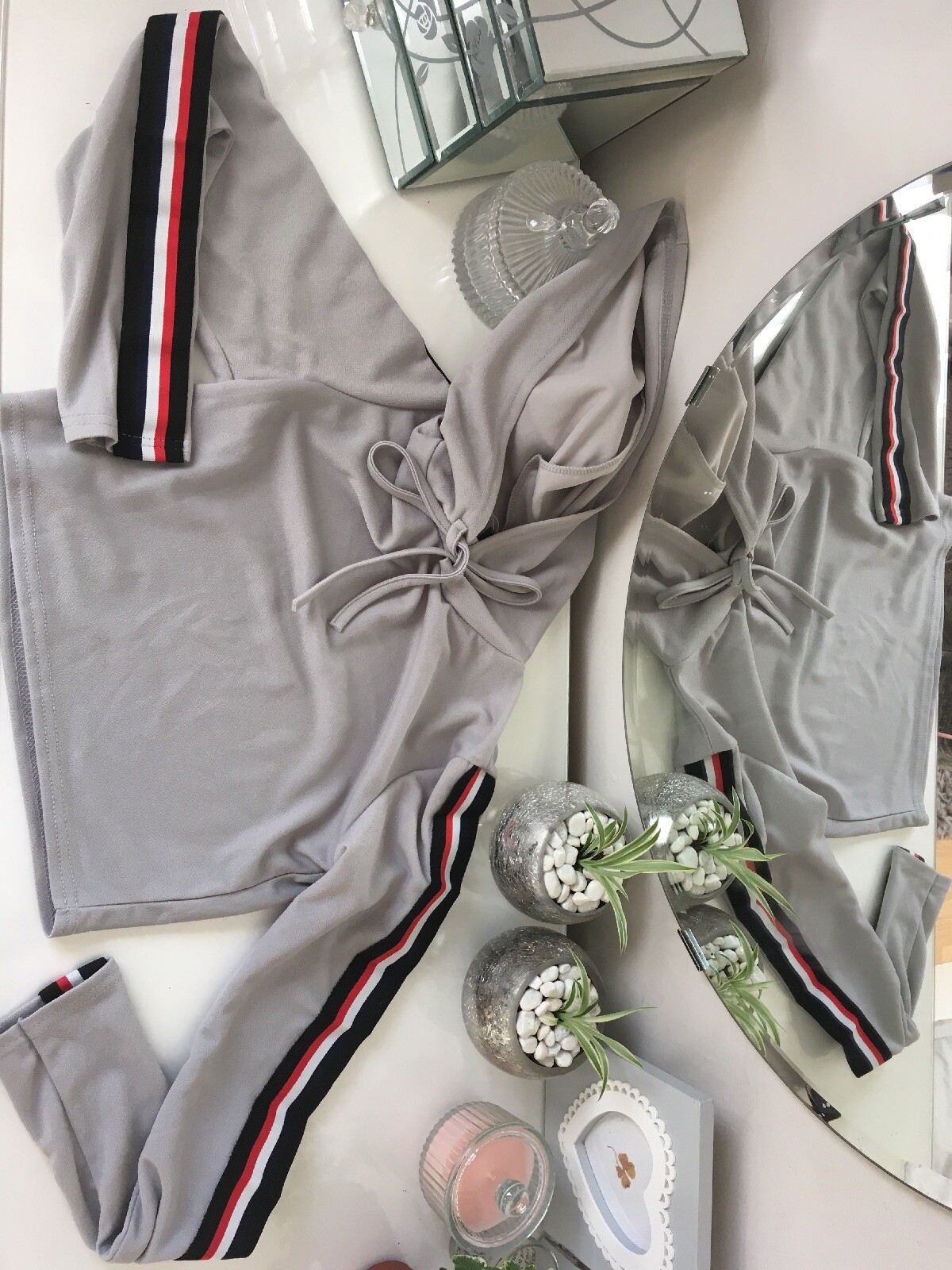 как выглядит grey loungewear Coord set S/M Crop Jumper Jogging Bottoms Stripe Tracksuit фото
