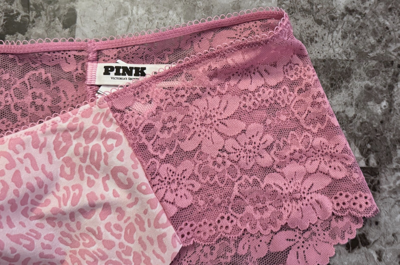 как выглядит NWT VICTORIAS SECRET PINK M LEOPARD CHEETAH FLORAL LACE NO SHOW CHEEKY PANTIES фото