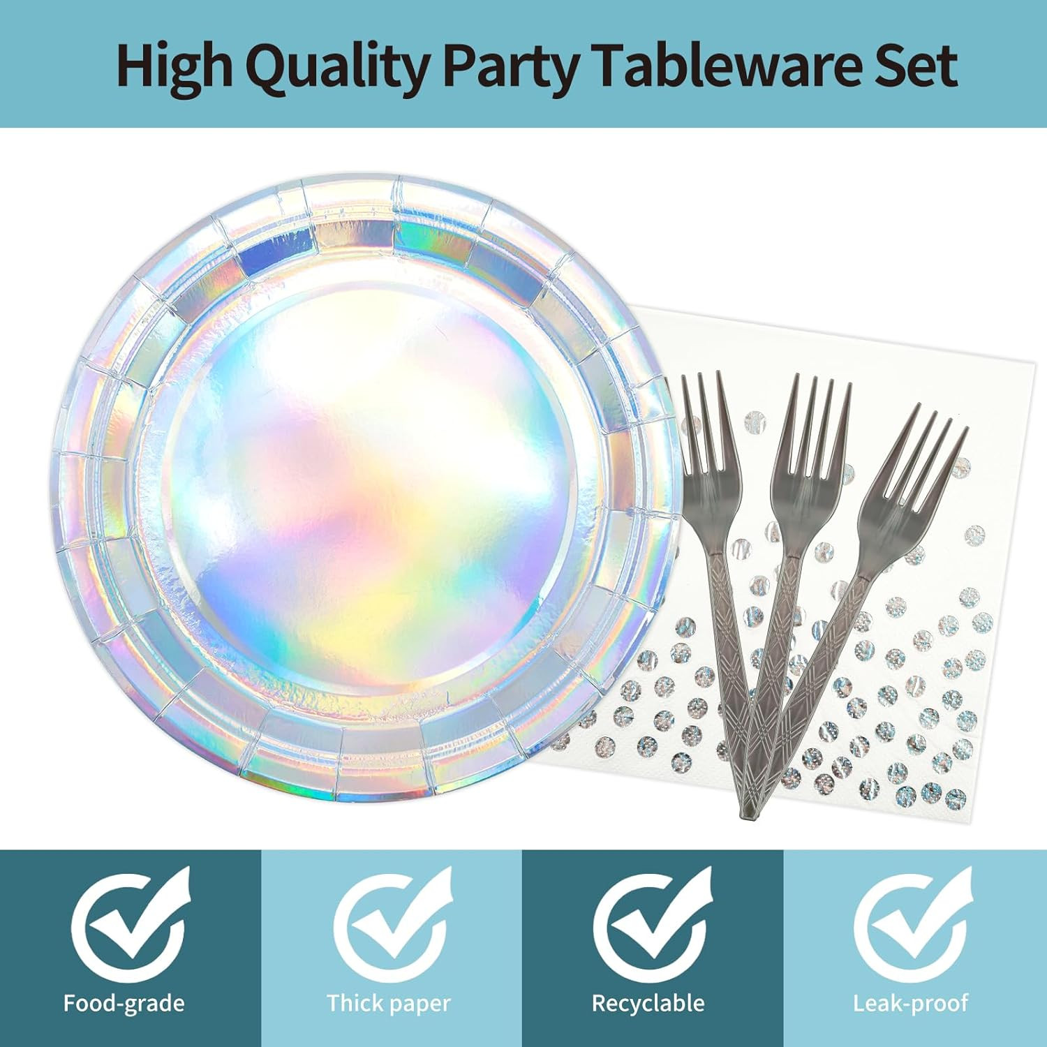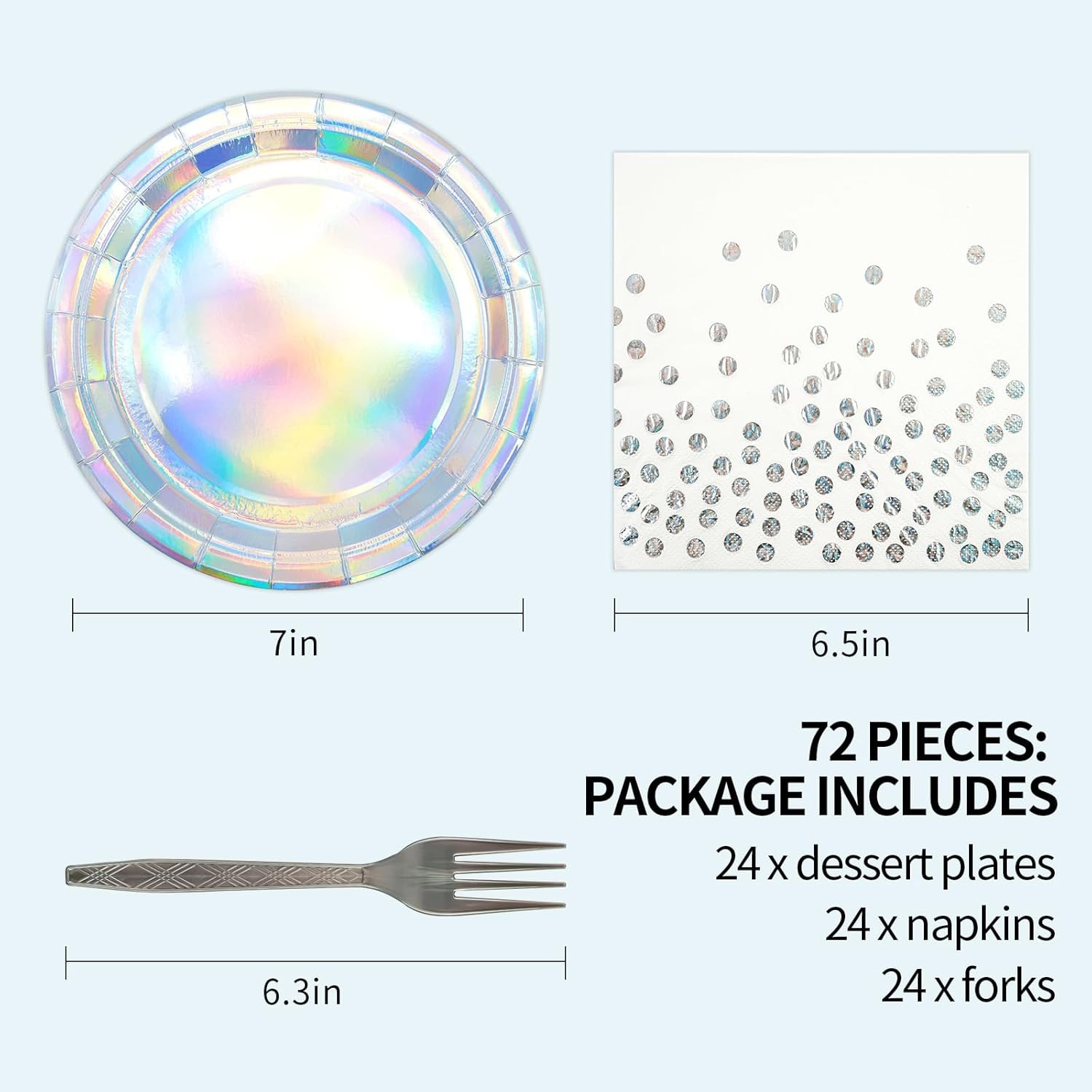 72Pcs Iridescent Silver Plates and Napkins Party Supplies, Holographic Dispos...