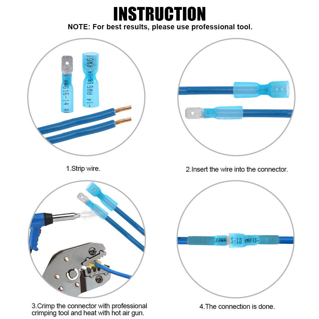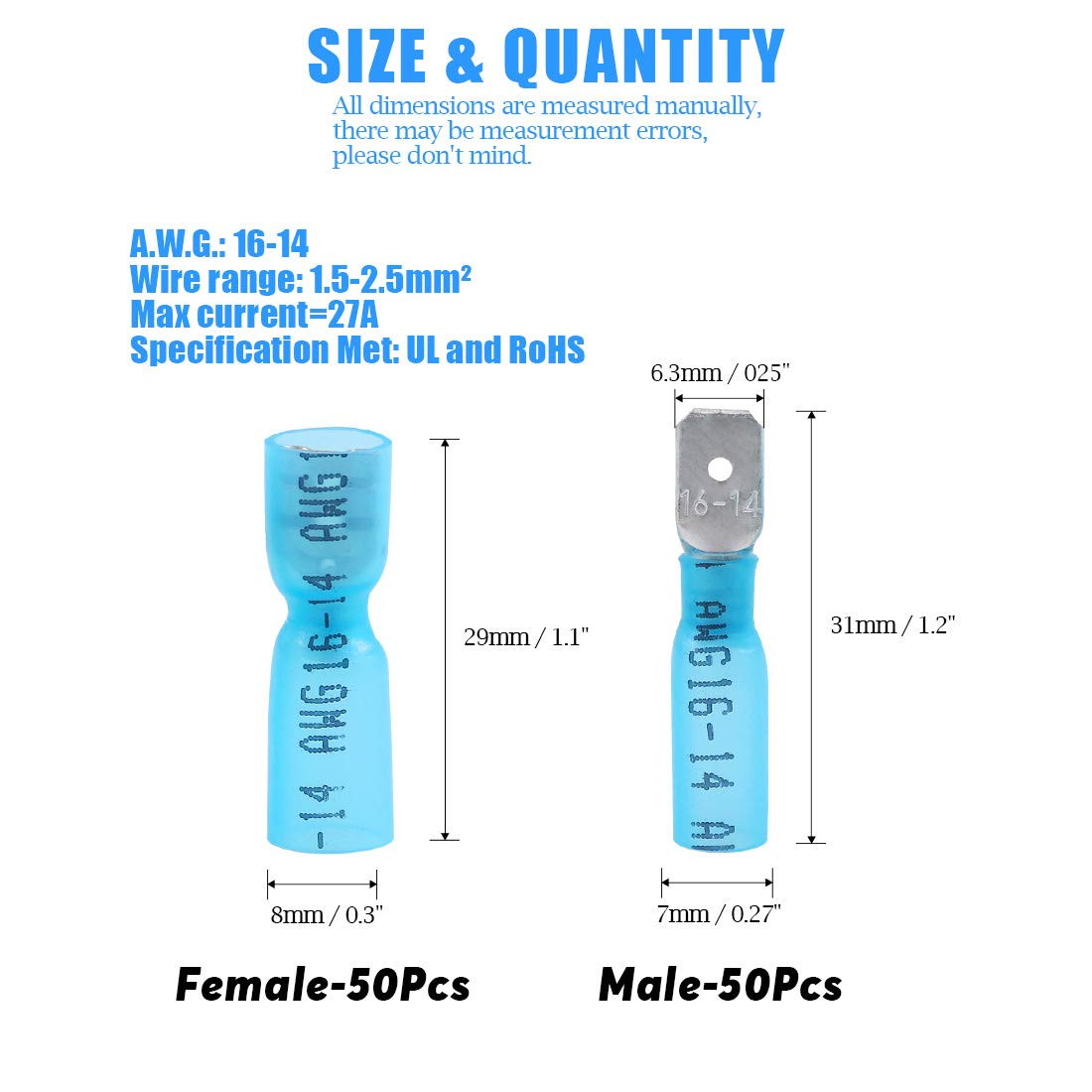 100Pcs 16-14 Gauge Fully Insulated Female/Male Spade Nylon Heat Shrink Waterproo