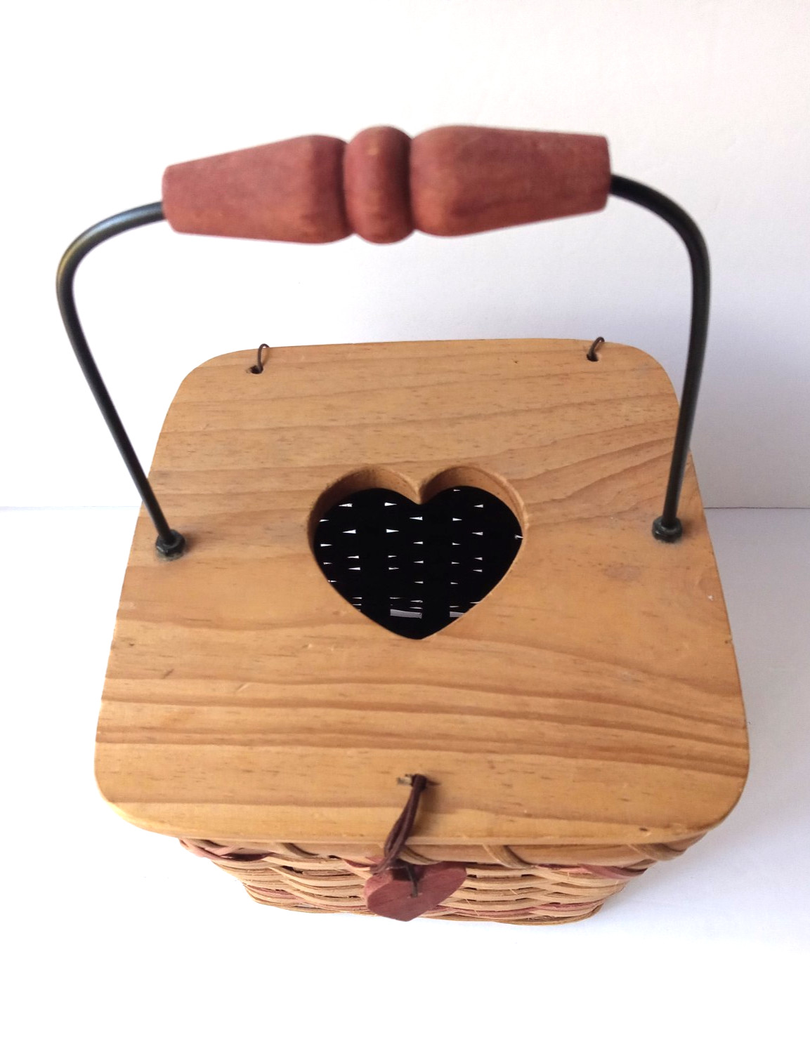 Woven Wicker Red Heart Tissue Box Holder Basket Pine Wood Lid Metal Handle Vtg