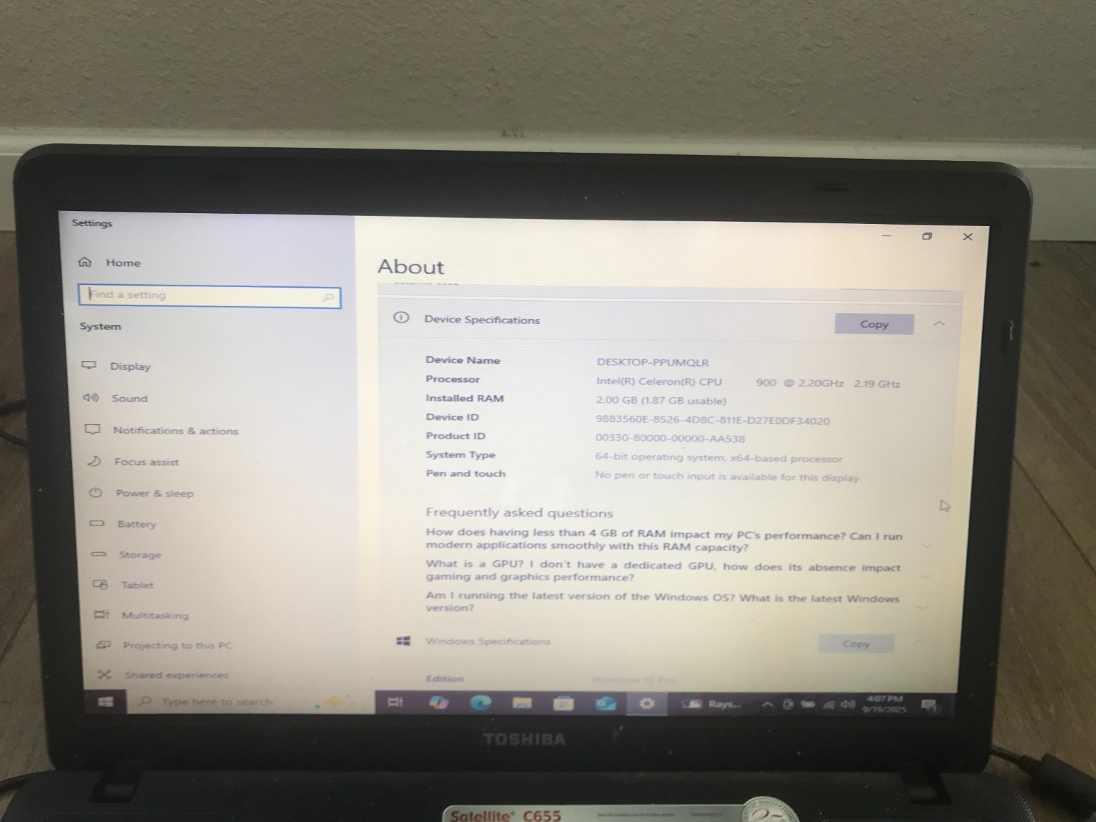 Toshiba Satellite C655-S5049 15.6 Intel Celeron 900 2.20GHz 2GB RAM 250GB HDD