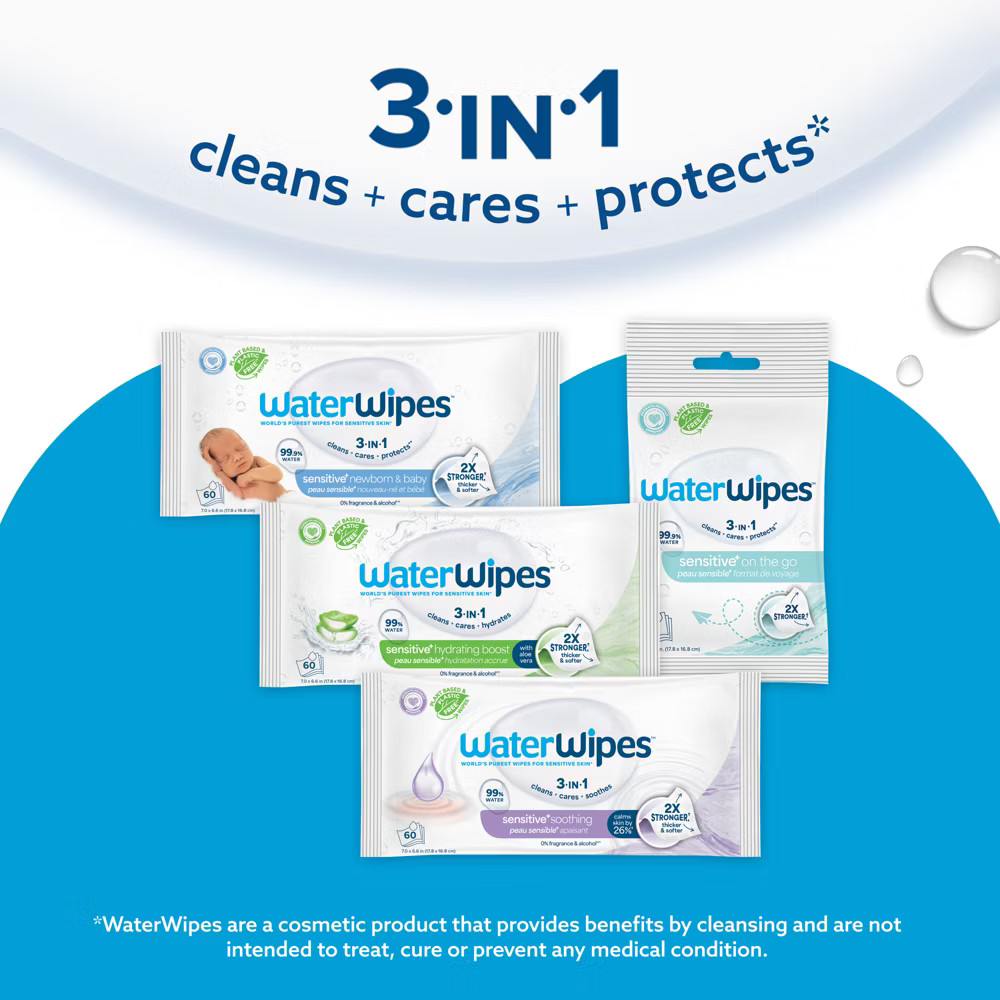 WaterWipes Sensitive Newborn Baby Wipes, 3-In-1 Cleans, Cares, Protects,