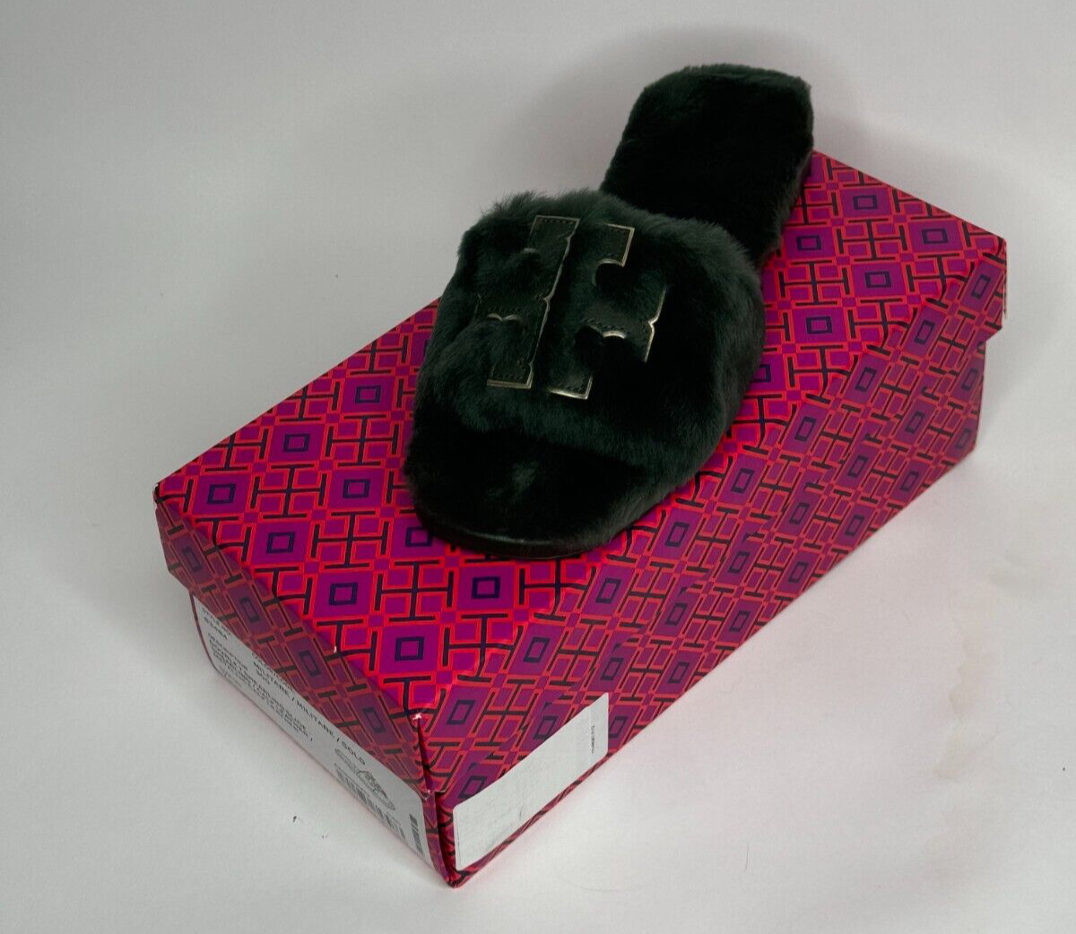 как выглядит Tory Burch Double T Shearling Slides Sandal Militare Green Gold Leather 7 NIB фото
