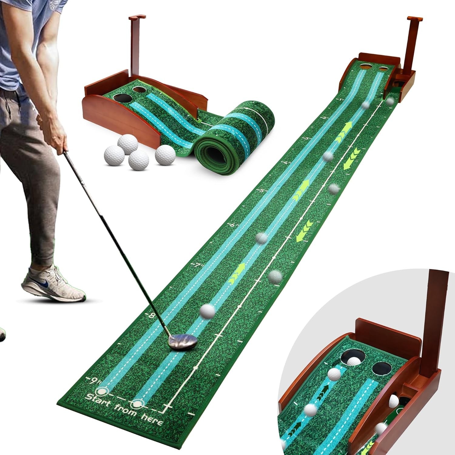 Indoor Putting Green with Motorized Ball Return, Wood Base, and Wrinkle-Free