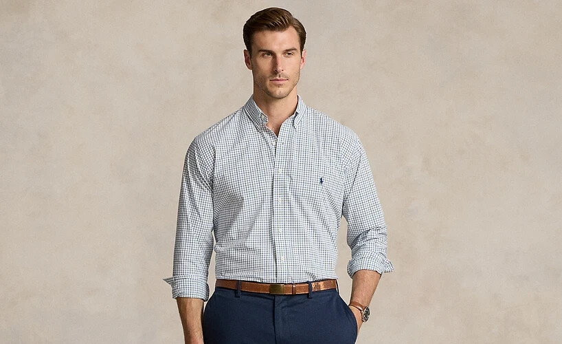 как выглядит 125 Polo Ralph Lauren Mens Slim Fit Stretch Poplin Shirt, Blue/Green, Small фото