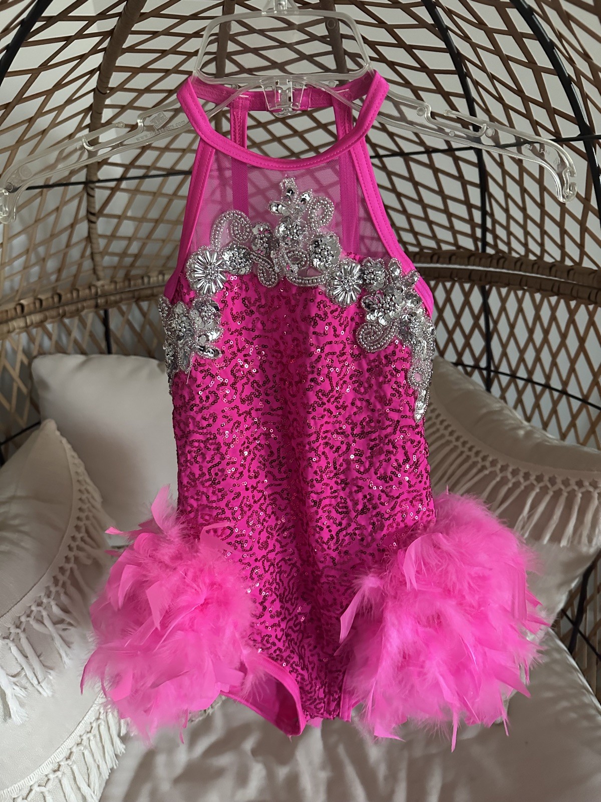 как выглядит Weissman Dance costume hot pink sassy feather MC child фото