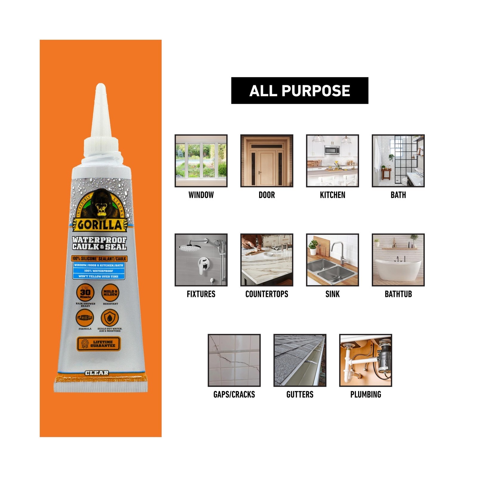 Gorilla 100 Silicone Caulk, Waterproof Sealant, 2.8oz Squeeze Tube Pack of ...