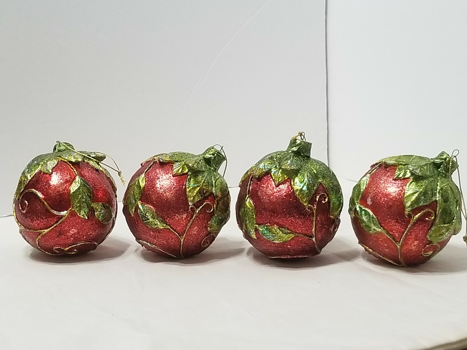 как выглядит RARE SET OF 4 SHIMMERING RED APPLES WITH LEAF VINES CHRISTMAS ORNAMENTS 3.5" фото