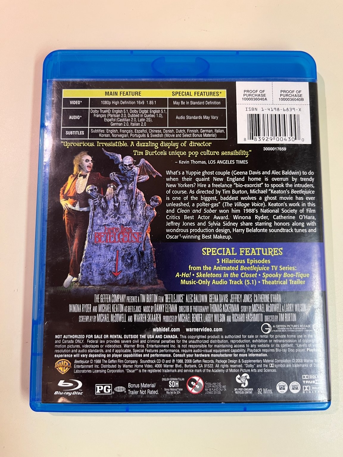 Beetlejuice Blu-ray, 1988, Tim Burton, Michael Keaton, Winona Ryder, Bonus