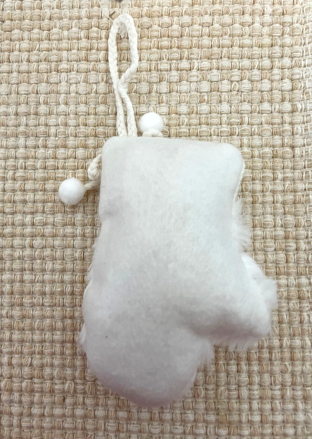 Faux Fur White Stuffed Mitten Christmas ornament, hanging, 4 1/2 T, NWT