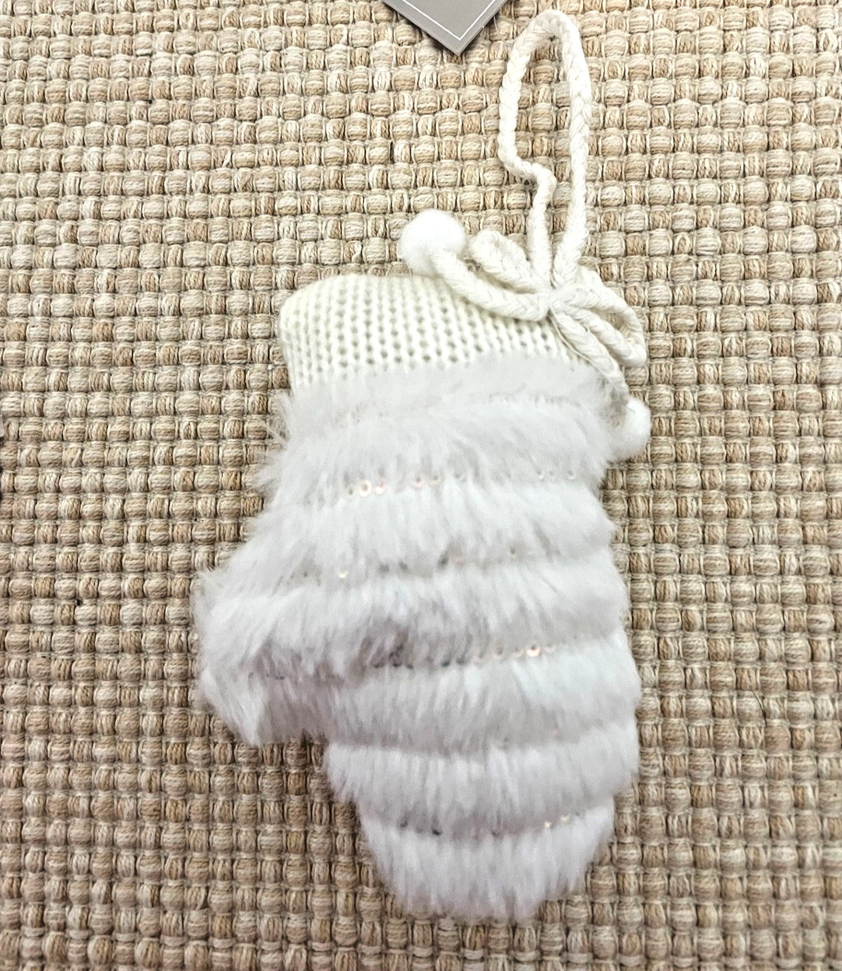 как выглядит Faux Fur White Stuffed Mitten Christmas ornament, hanging, 4 1/2" T, NWT фото