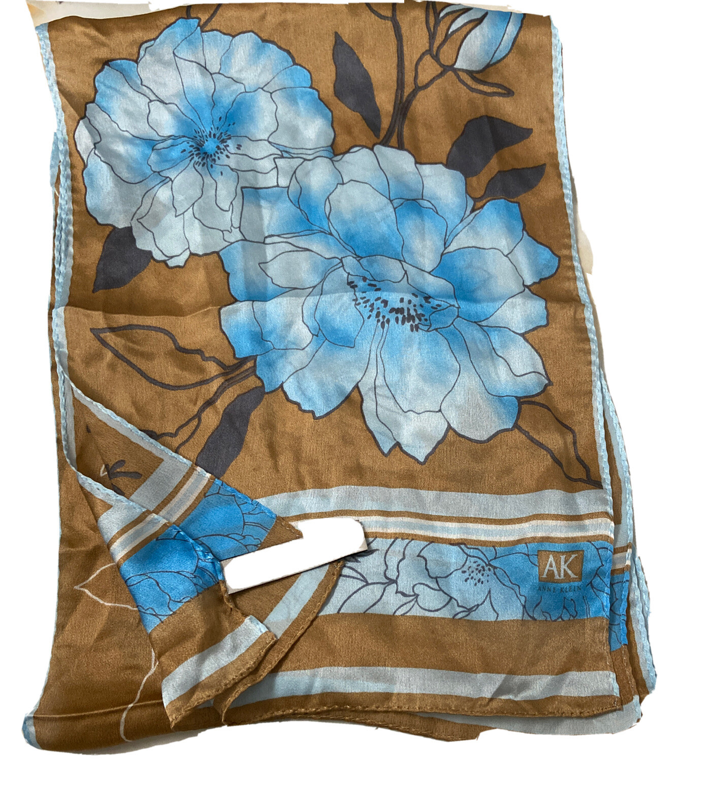 Anne Klein AK Silk Rectangular Scarf Floral design Blue Brown 60 X 10 vg