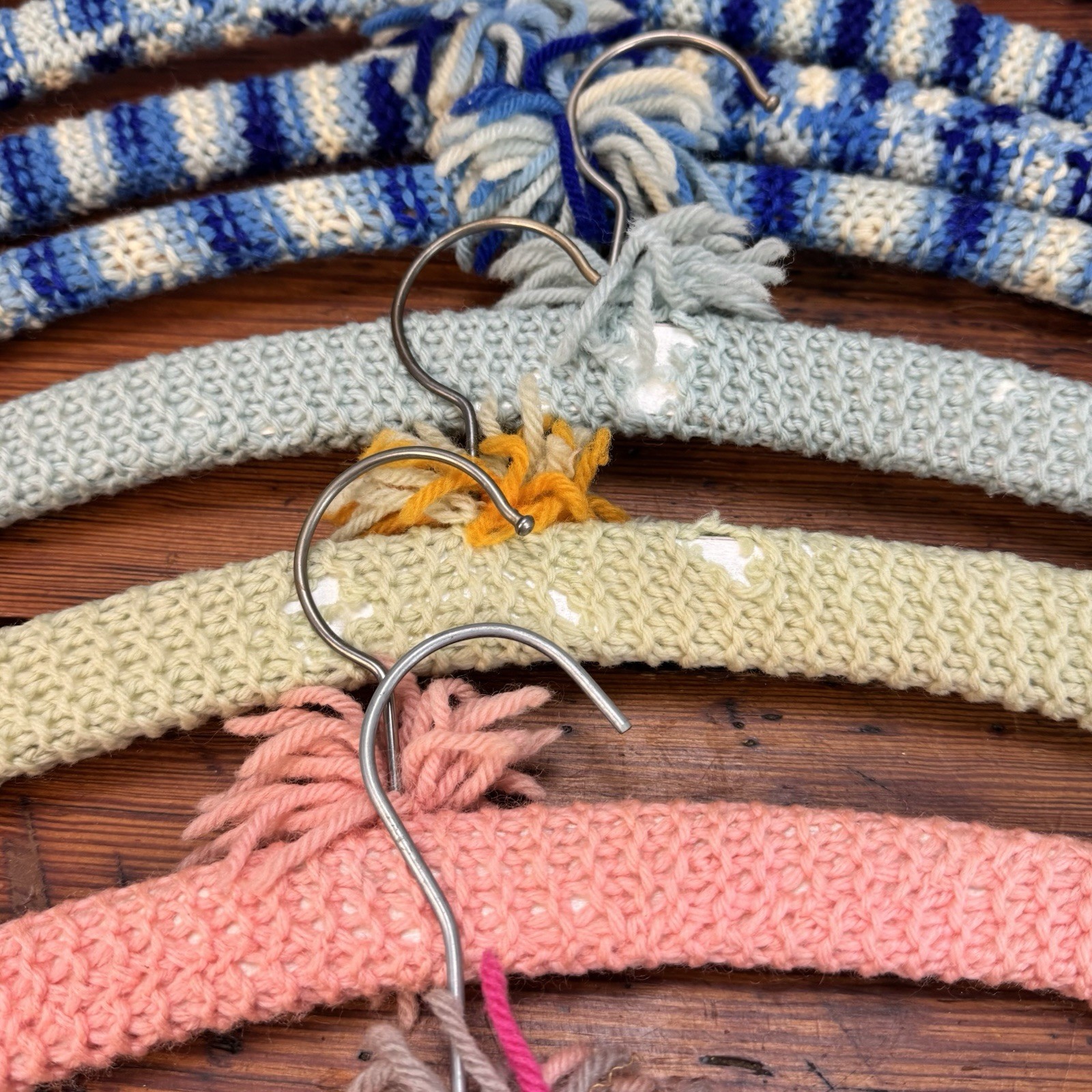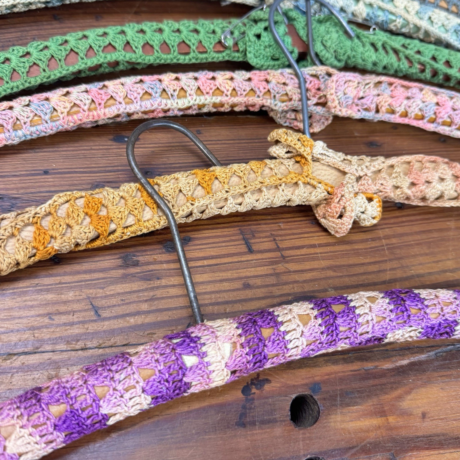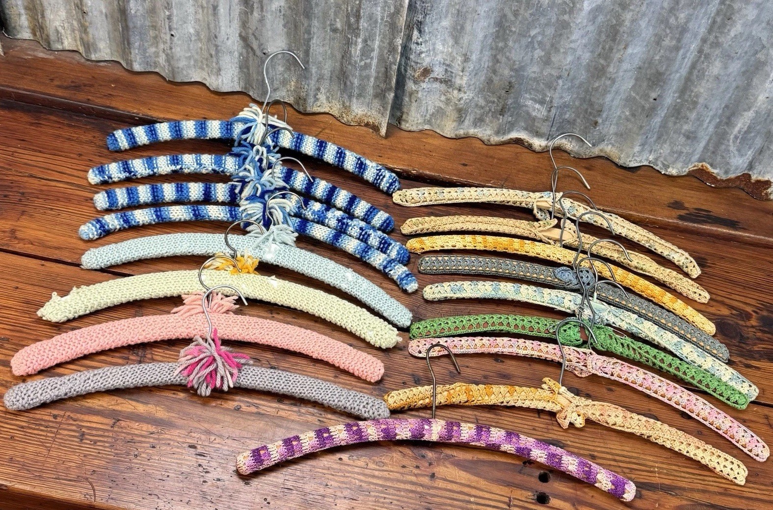17 Vintage HAND KNIT CROCHETED Wooden CLOTHES HANGERS Blue Pink Purple Pastel
