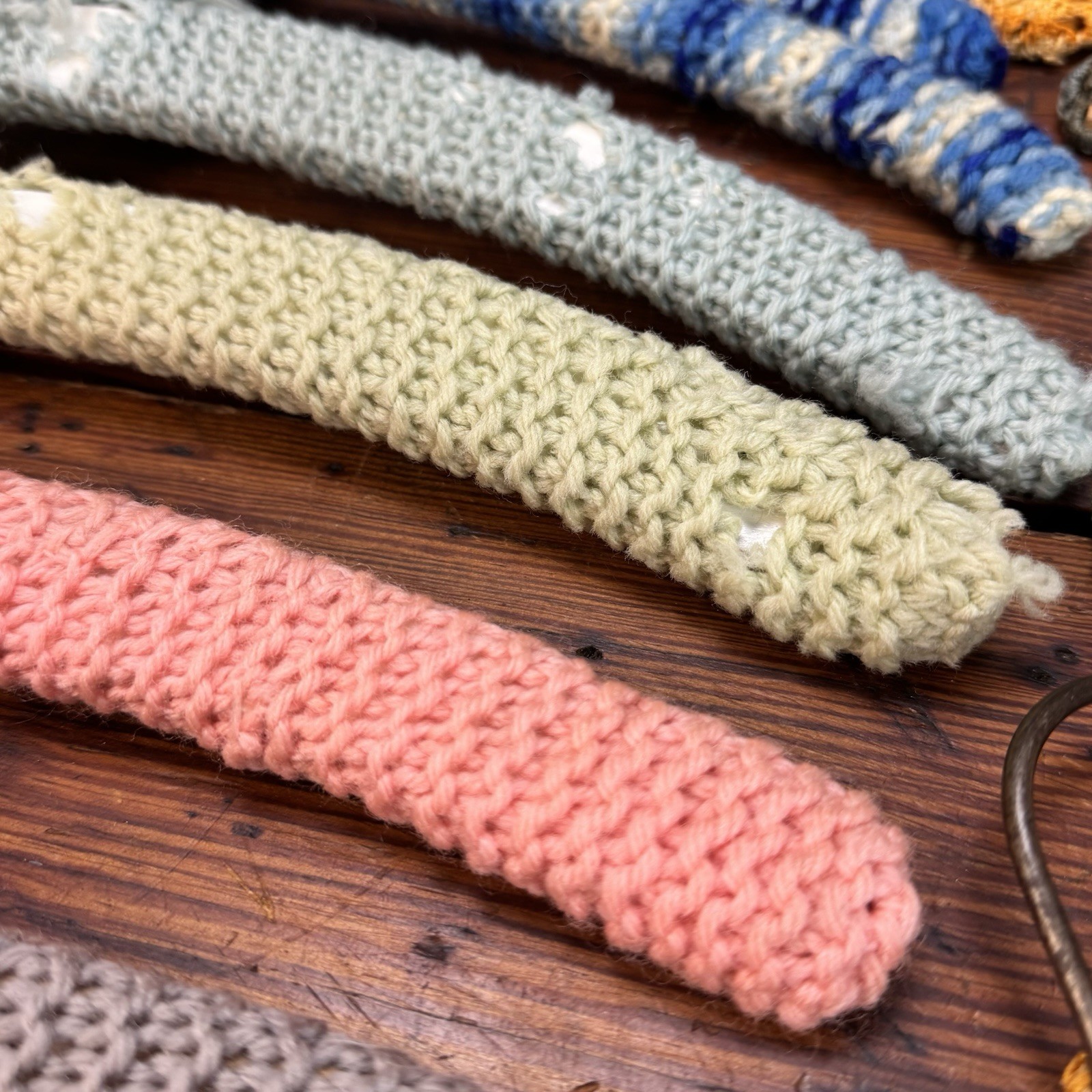 как выглядит 17 Vintage HAND KNIT CROCHETED Wooden CLOTHES HANGERS Blue Pink Purple Pastel фото