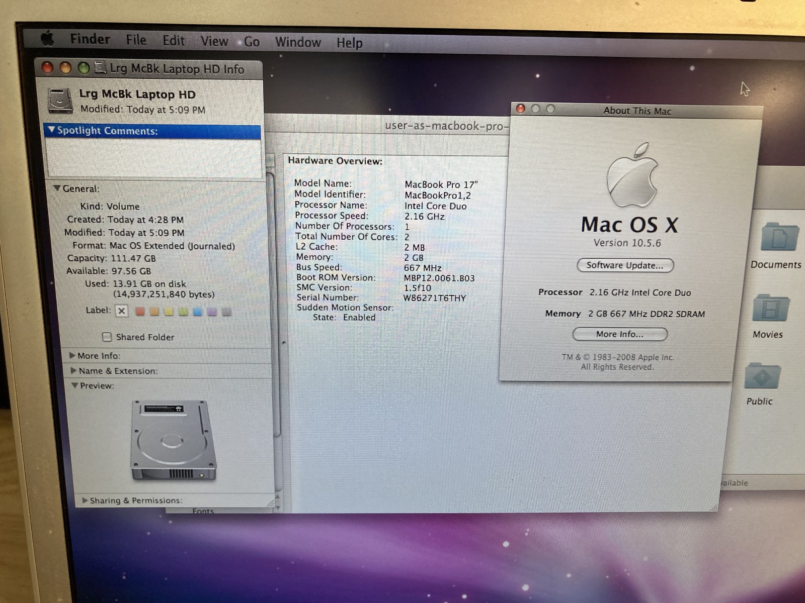 Apple MacBook Pro 17 A1151 2.16GHz 2GB RAM 120GB HDD OSX 10.5 New Batt MA092LLA