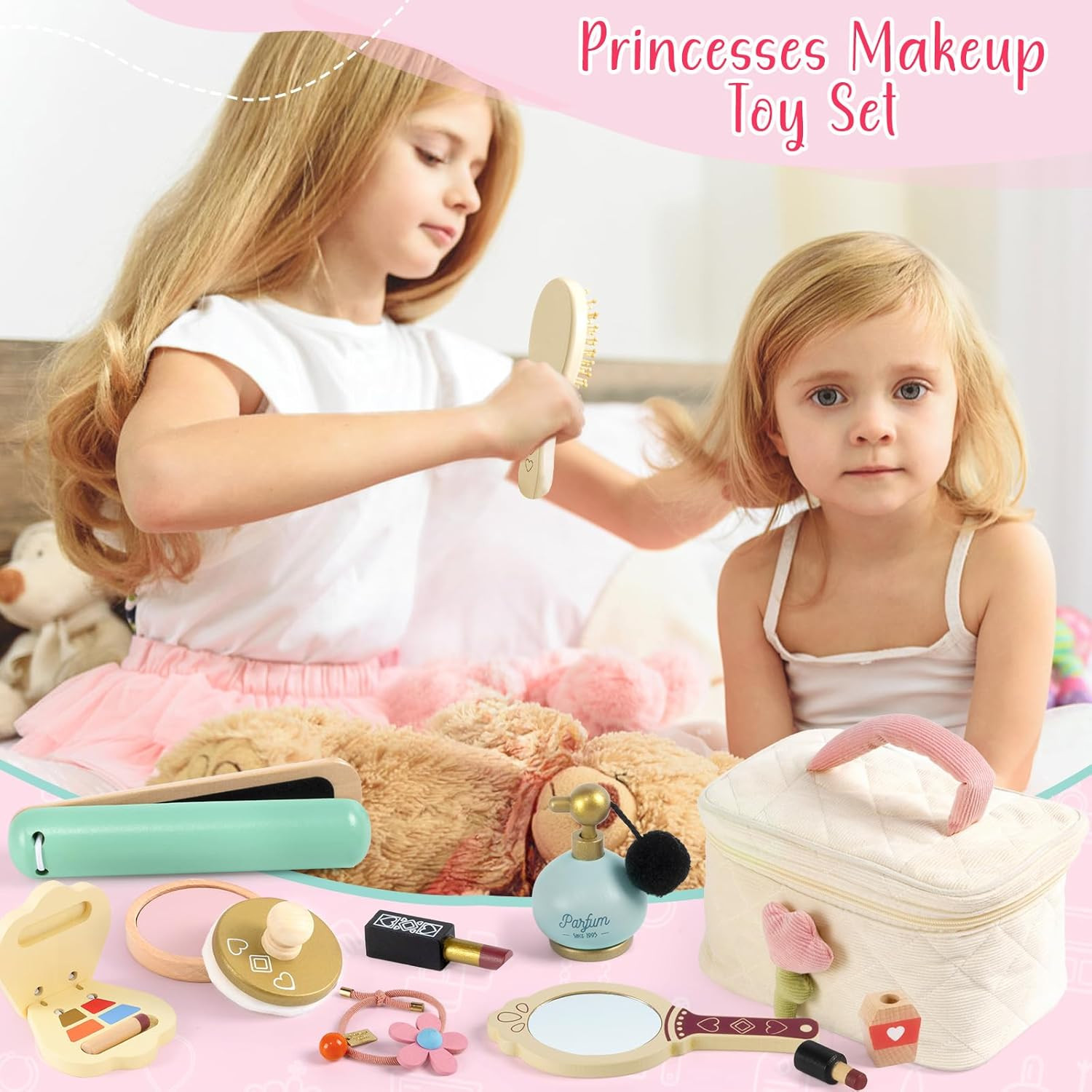 Wooden Makeup Toy Set, 15Pcs Hair Salon Girl Toys Toddler Pretend Play Makeup Ki