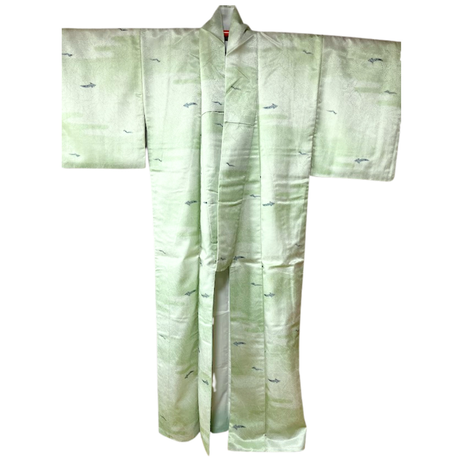Vintage Japanese Kimono Yellow Green Silk Blend Woman Wafuku Showa Era Used