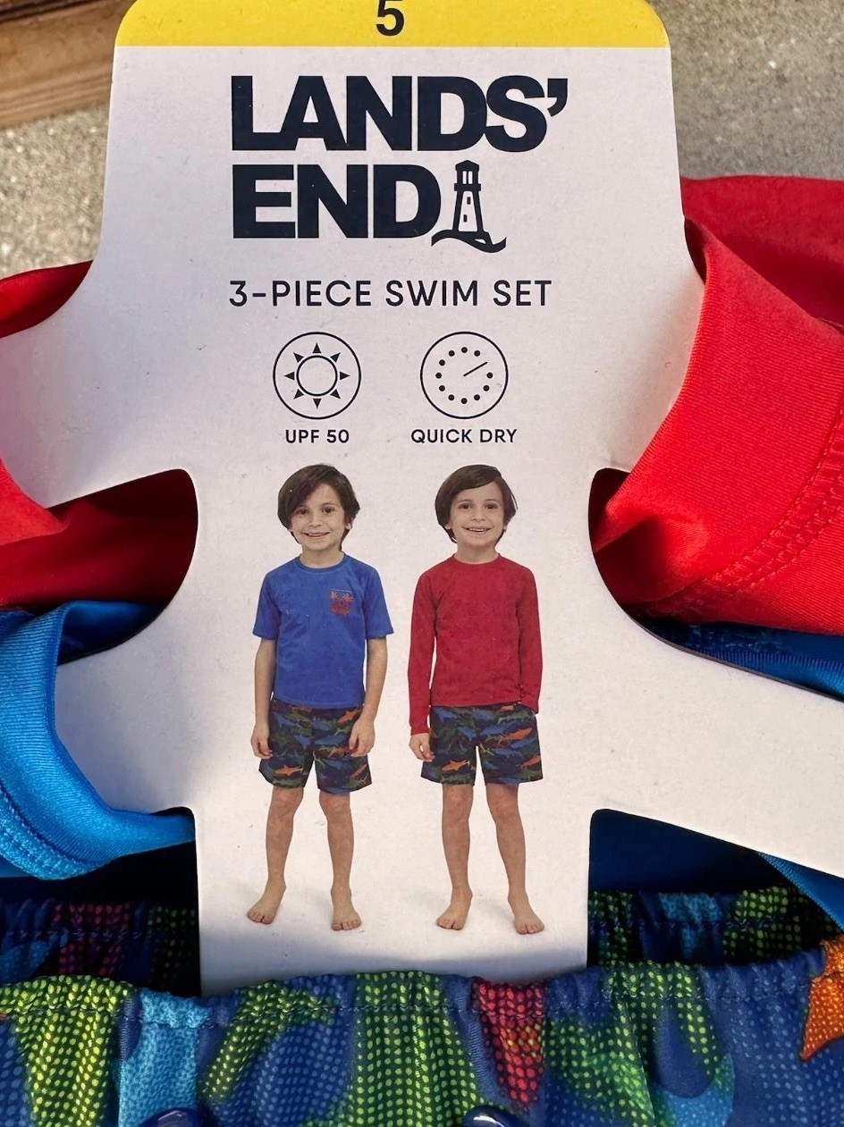 Lands' End 3 Piece Swim Set Rash-Guard Trunks Boy's Size 5 Red Shark Print