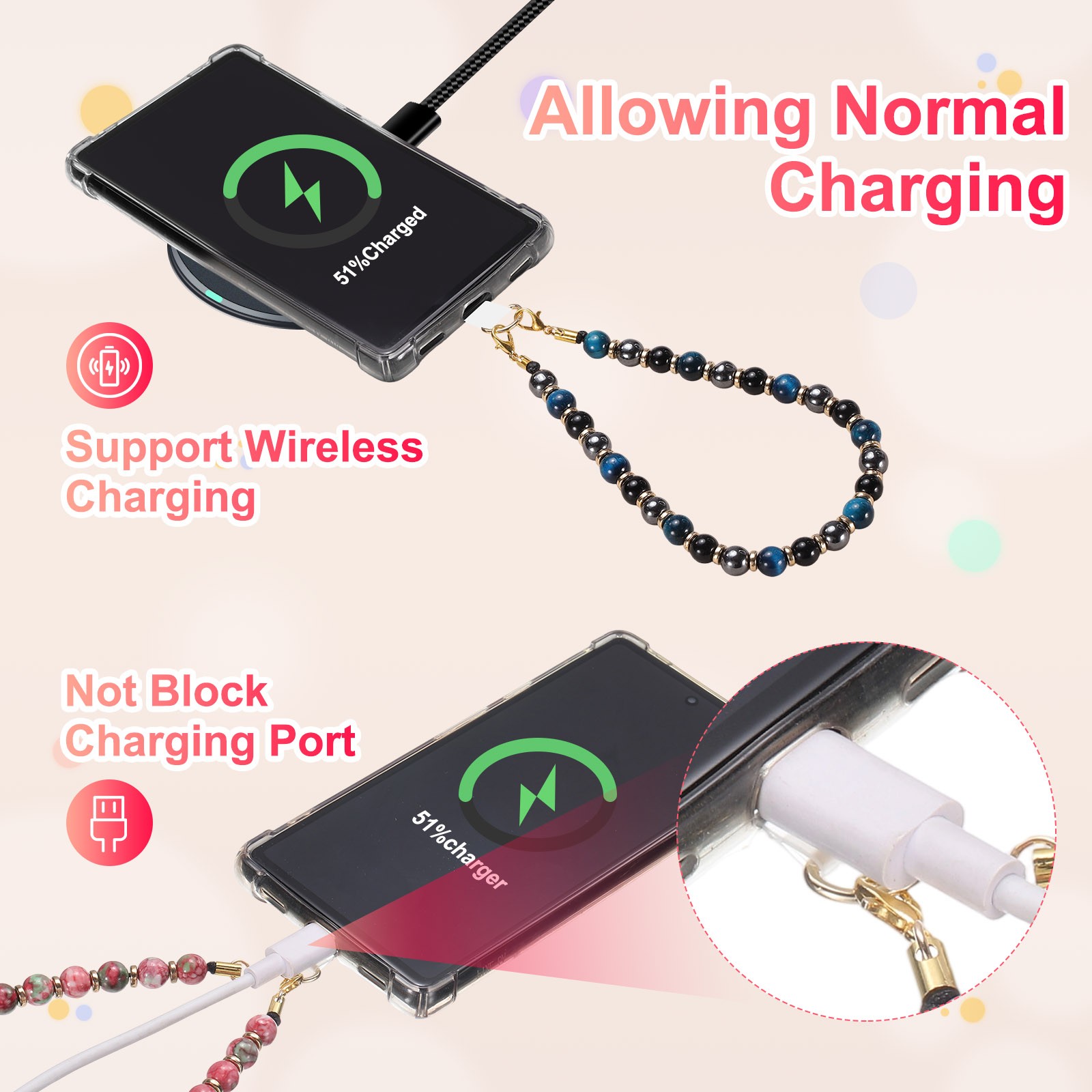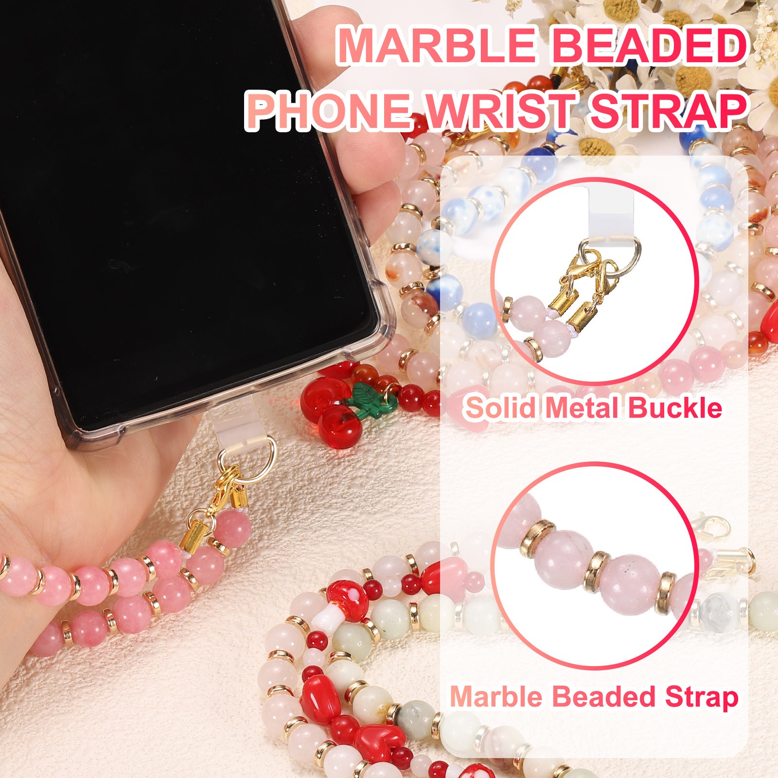как выглядит Marble Beaded Phone Wrist Strap, Cellphone Lanyard with Tether Tab, Clear Pink фото