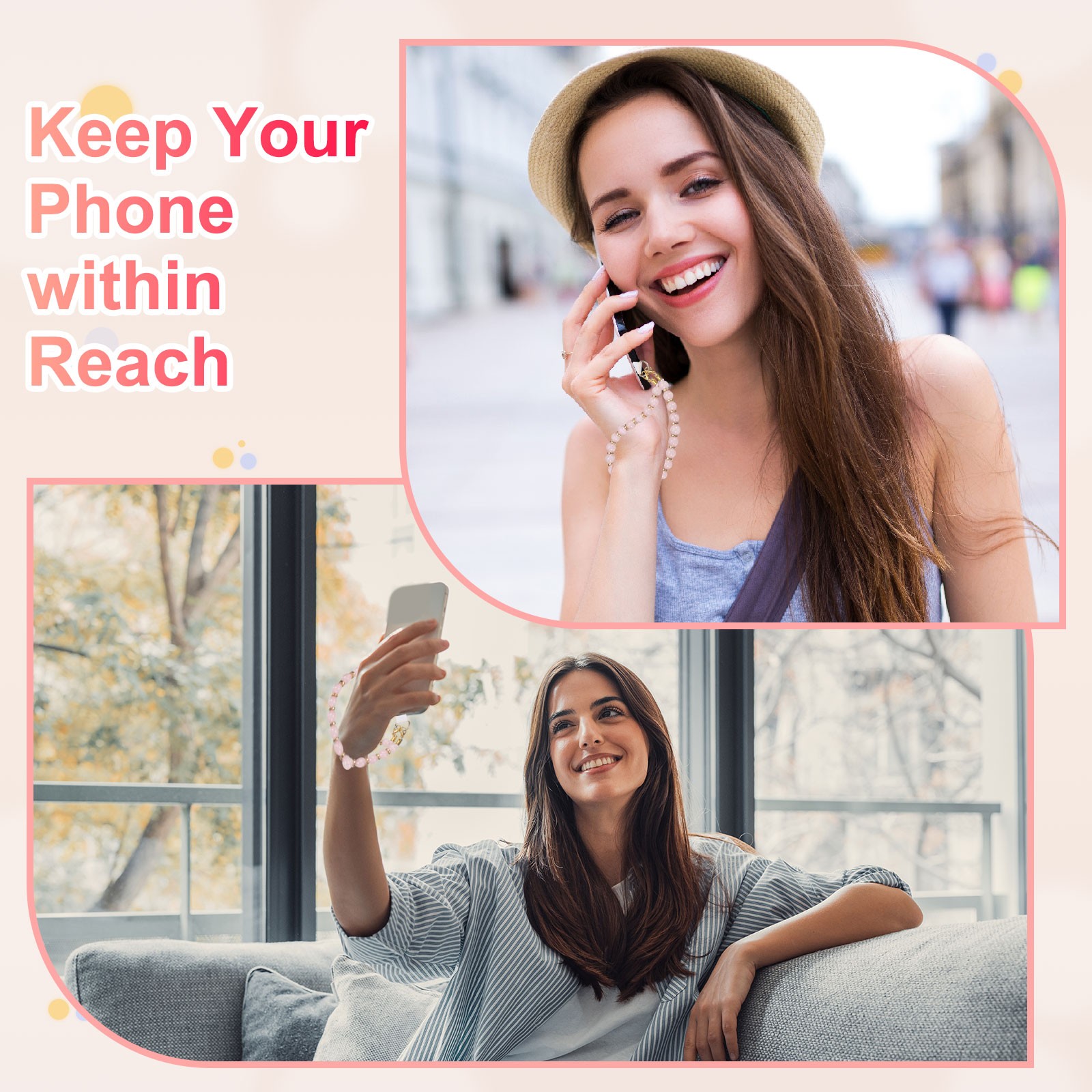 Marble Beaded Phone Wrist Strap, Cellphone Lanyard with Tether Tab, Clear Pink