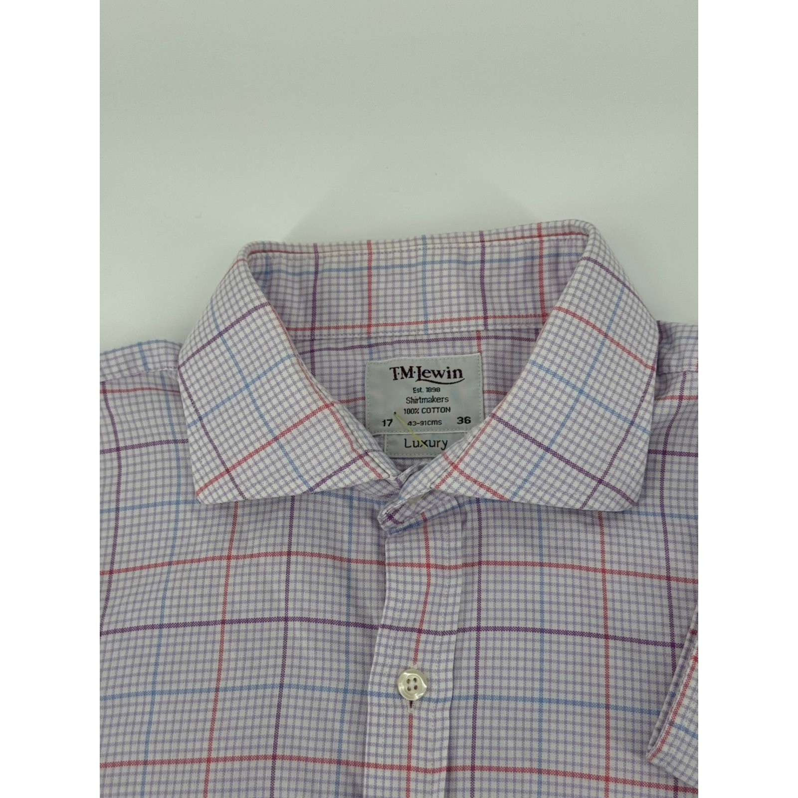 TM Lewin Luxury Shirt 17 36 Mens French Cuff Purple Plaid Checkered Long Sleeve