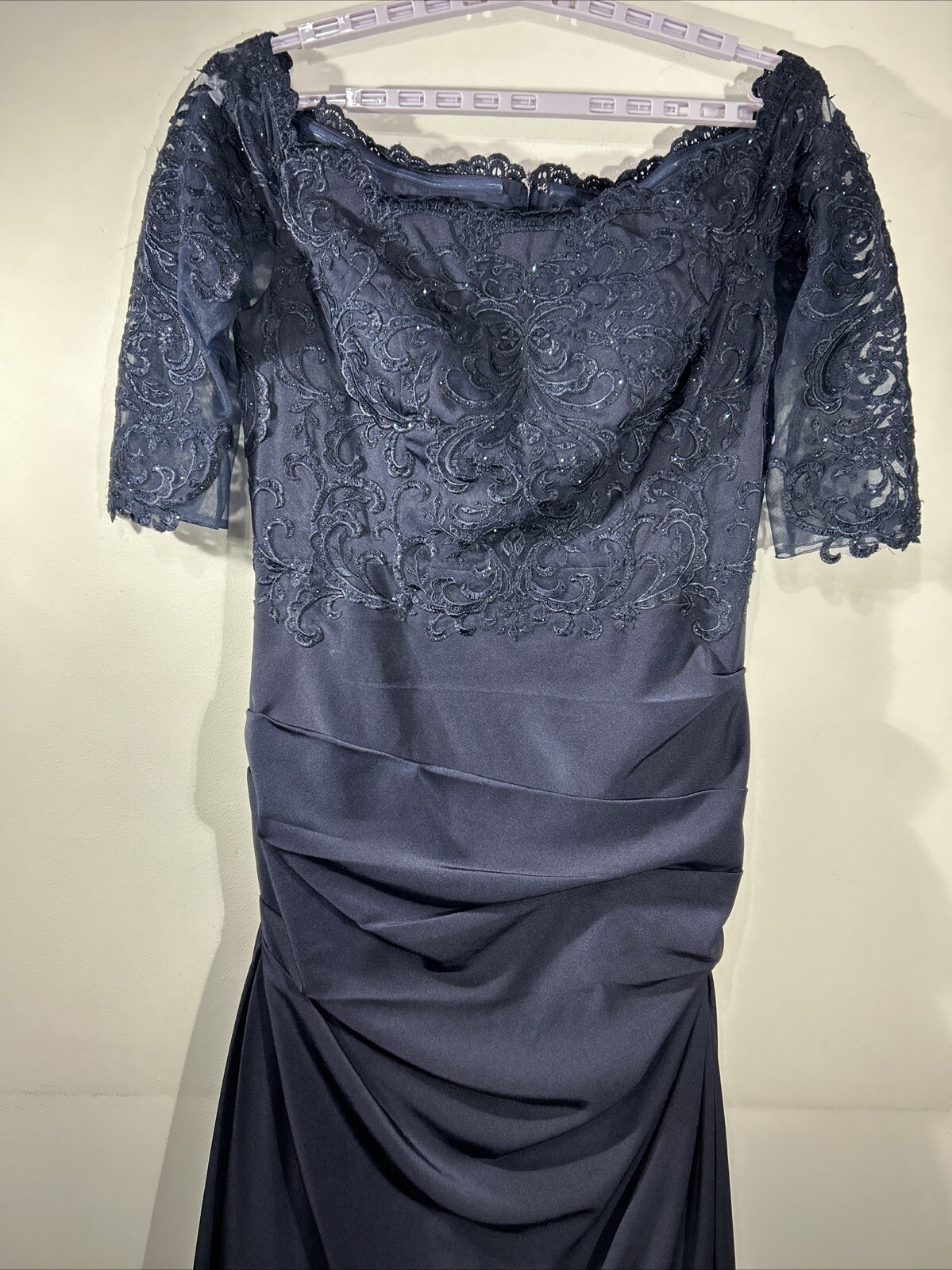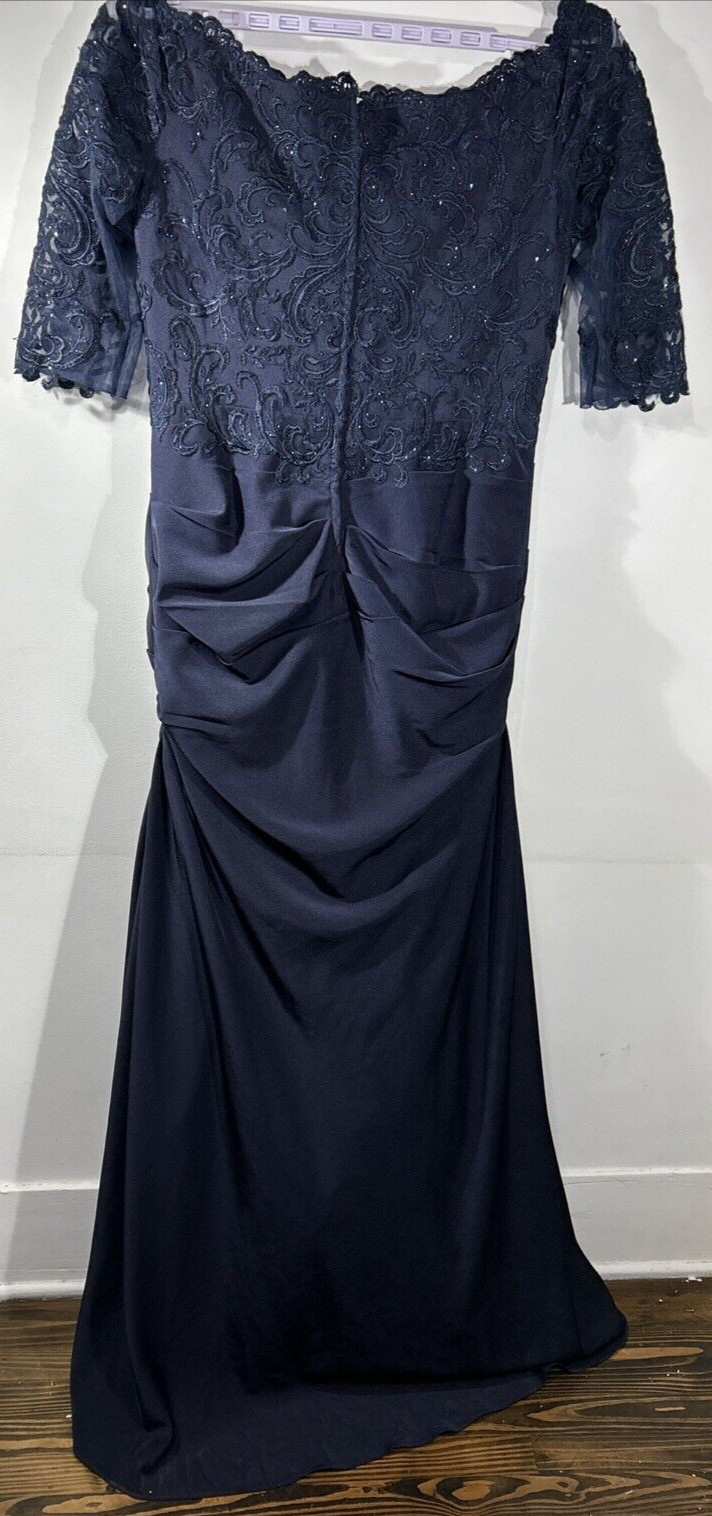 как выглядит La Femme Size: 12 Navy Blue Gown Formal Short Sleeve Scoop Lace Top фото