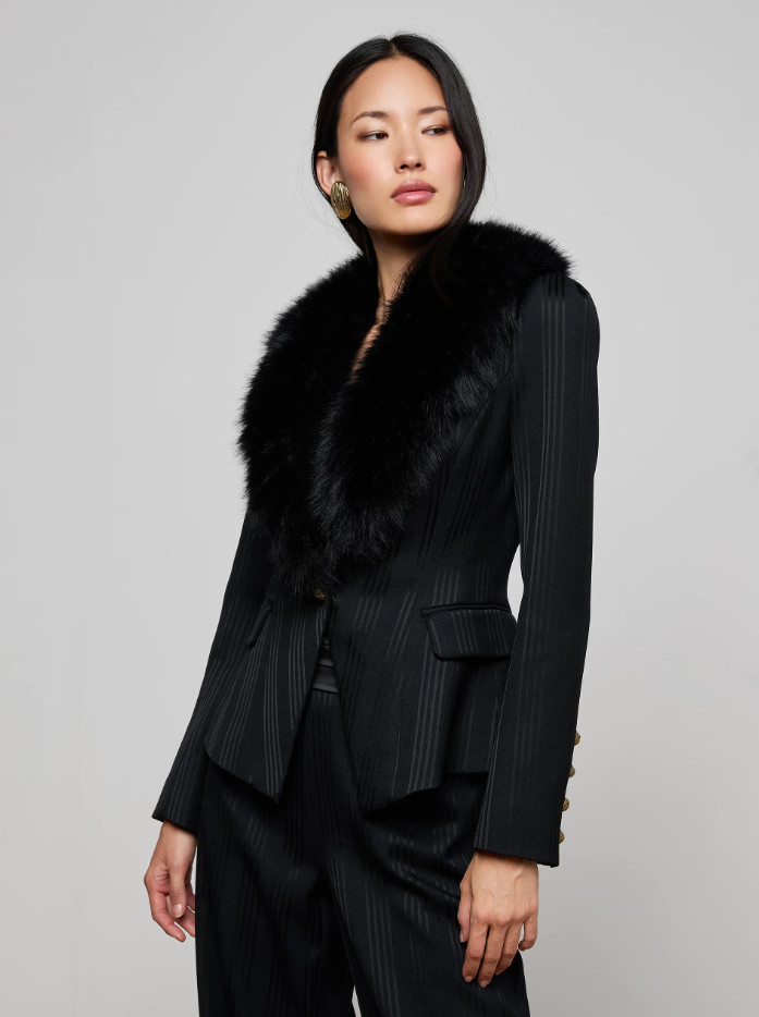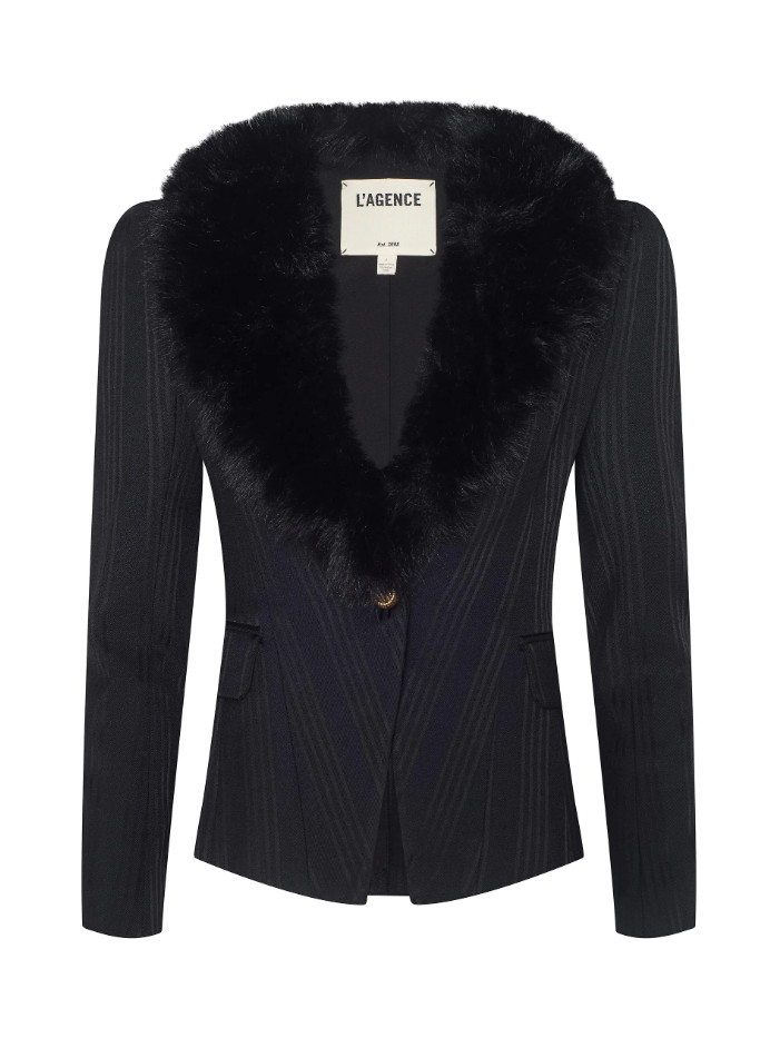 NEW AUTH L'AGENCE Kaisley Faux Fur Collar Blazer Black Shadow Stripe 0-12