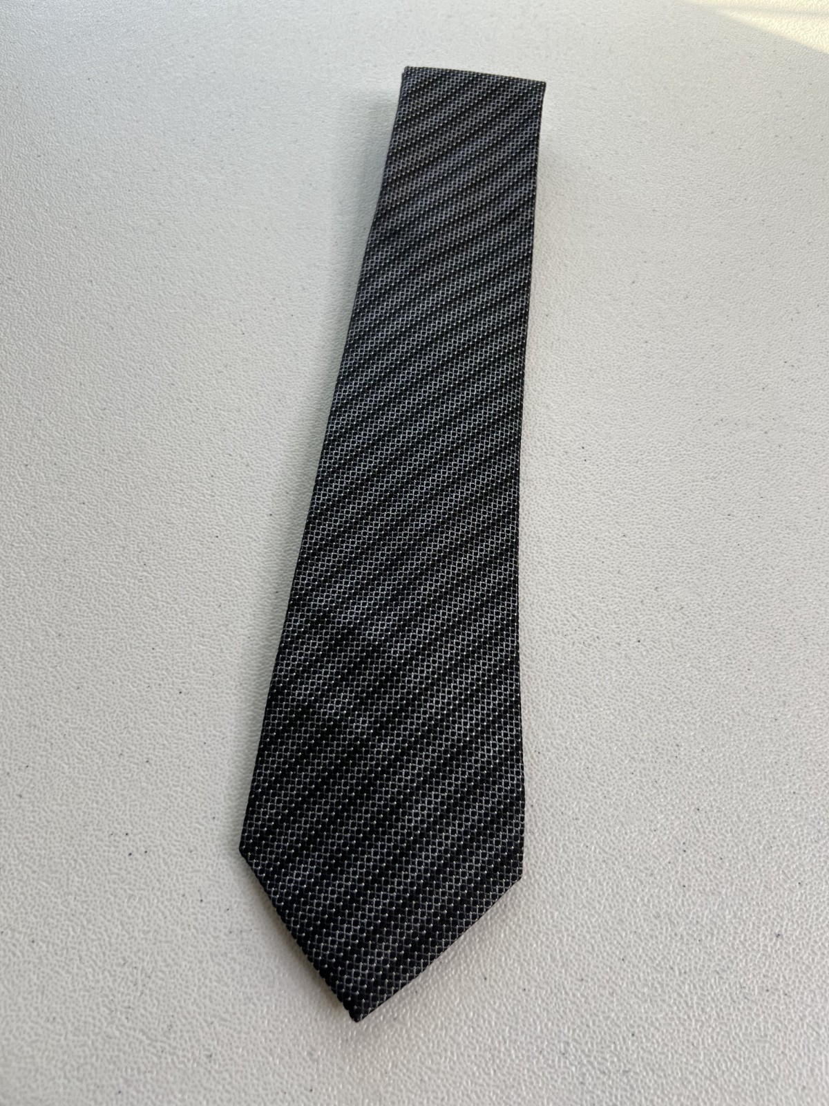 Kenneth Cole Reaction Black, Gray Striped/Geometric Pattern 100 Silk Tie NWOT