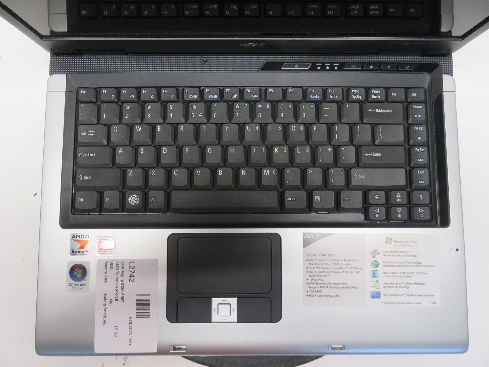 Acer Aspire 5100-3357 AMD Turion 64 MK-36 2000MHz 1.5 GB NO HDD No Batt
