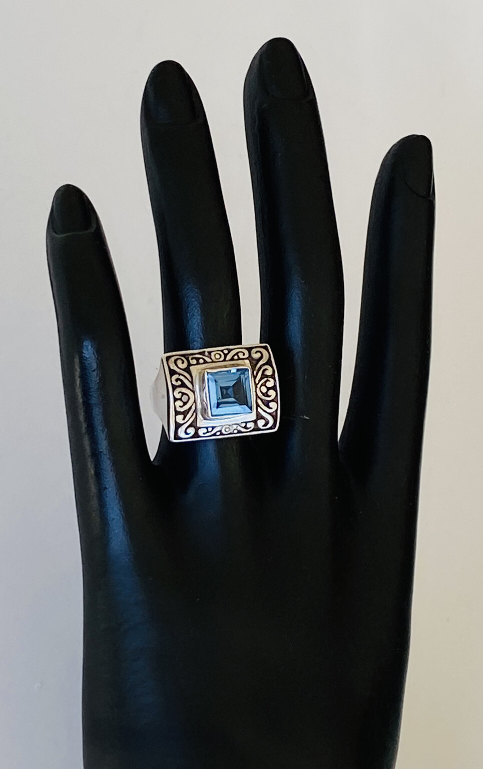 Vintage 925 Sterling Silver BLUE TOPAZ Ornate Scroll Ring Size 6 HEAVY 15-Grams