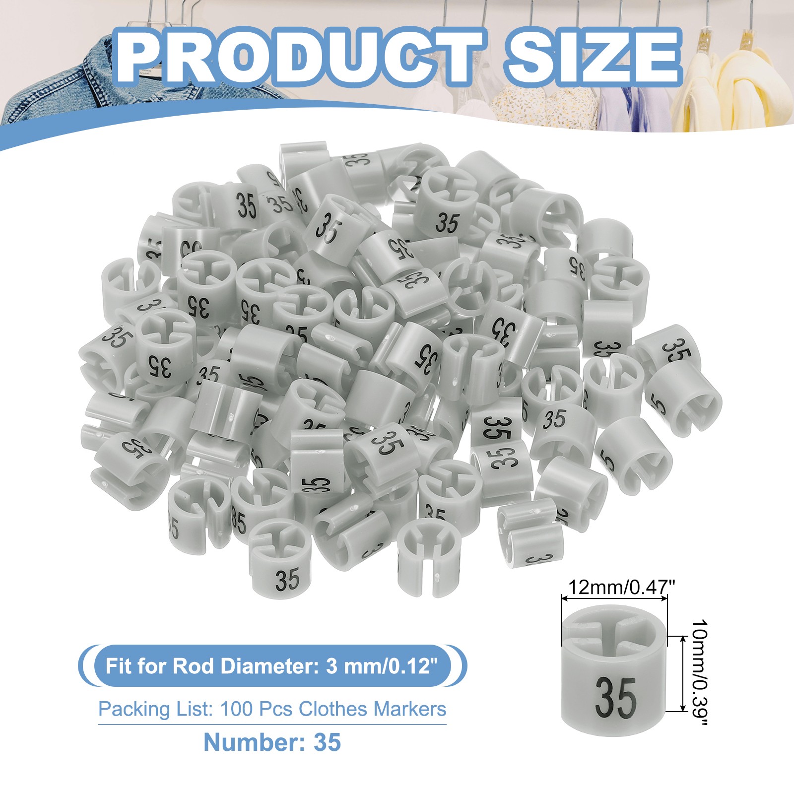 100 Pcs Clothes Hanger Marker Number 35 Tag Fit 3mm Rod Garment Size Tag Gray