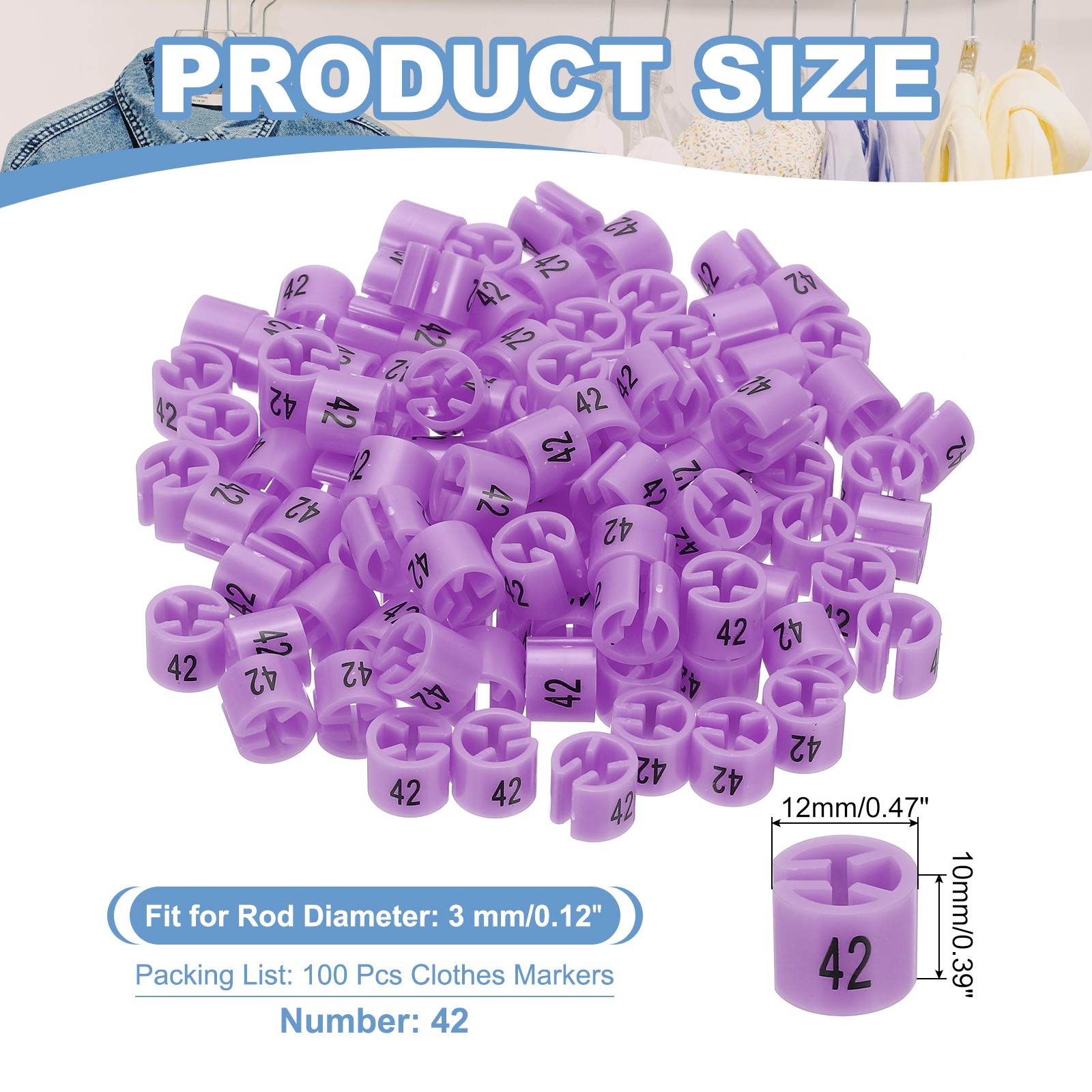 100 Pcs Clothes Hanger Marker Number 42 Tag 3mm Rod Garment Size Tag Purple Pink
