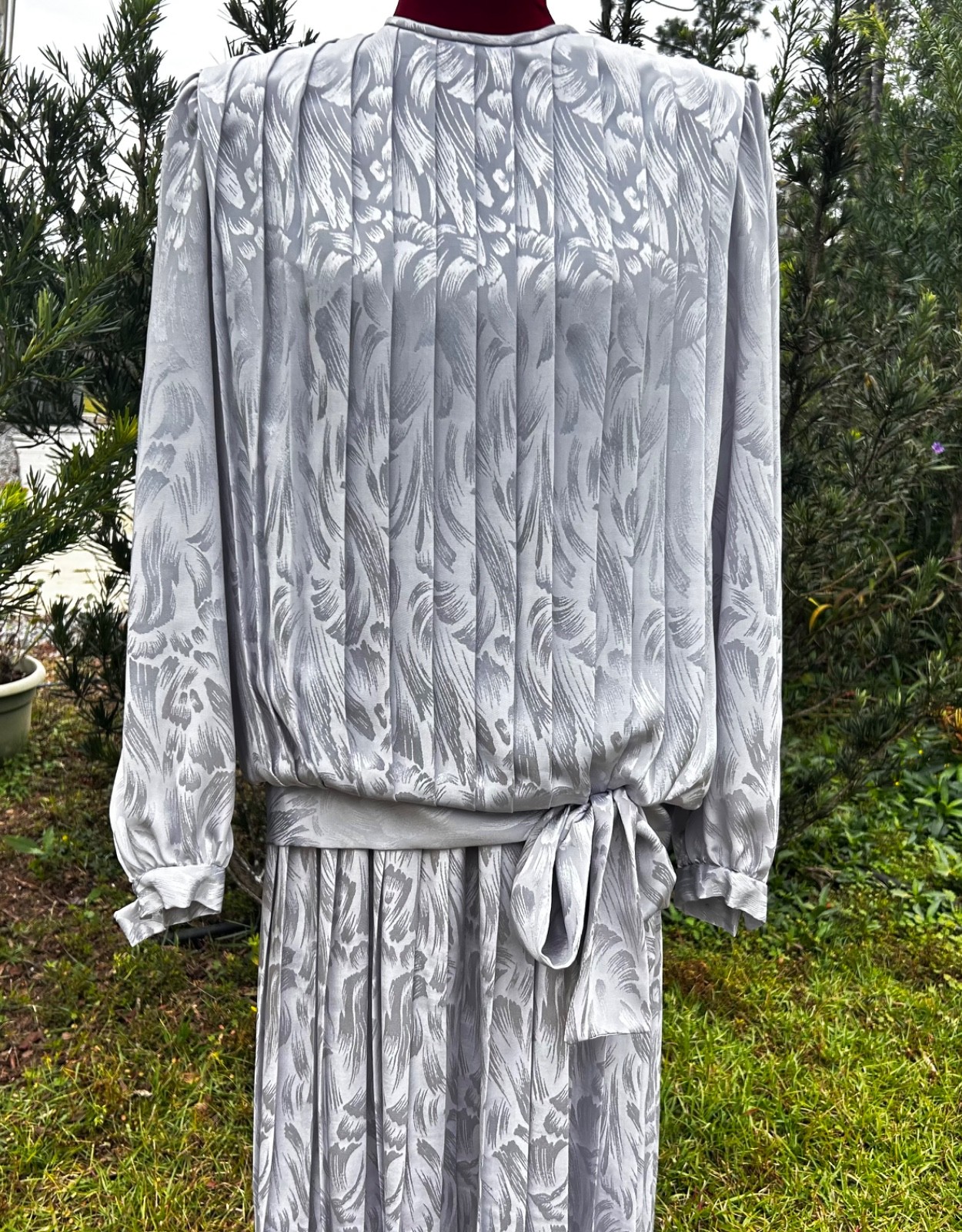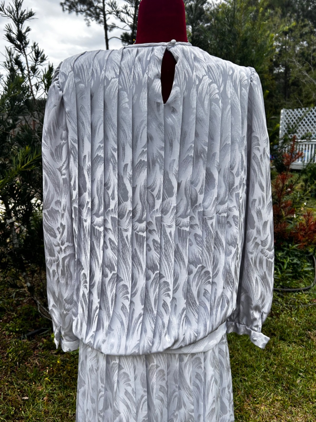 Vtg 80s Silver Jacquard Pleated Belted Blouse and Midi Skirt Set s 10