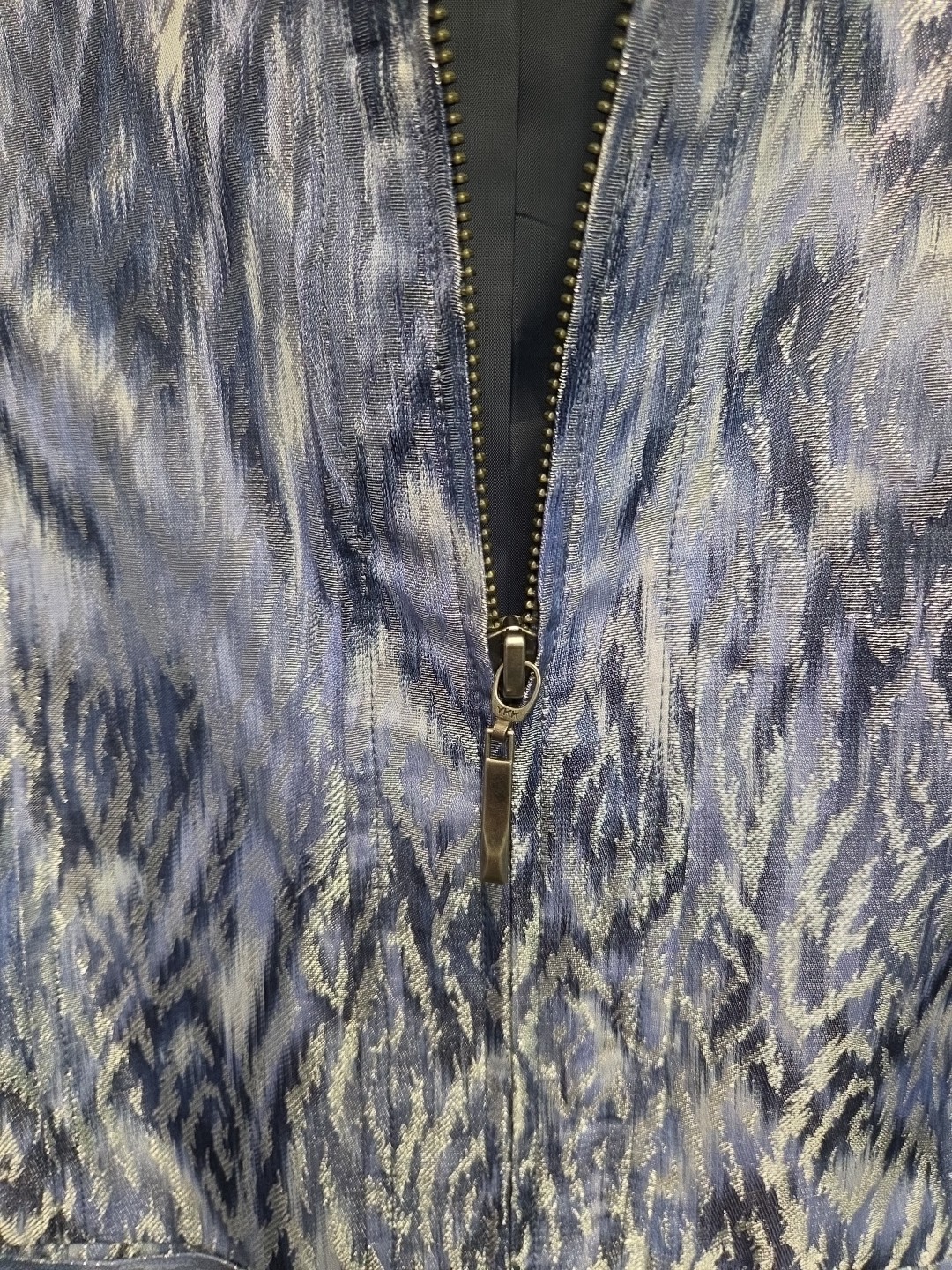 как выглядит Chicos Jacket Ikat Mandarin Collar Sz 1 M Metallic Zip Blue Silver Lined Y2K фото
