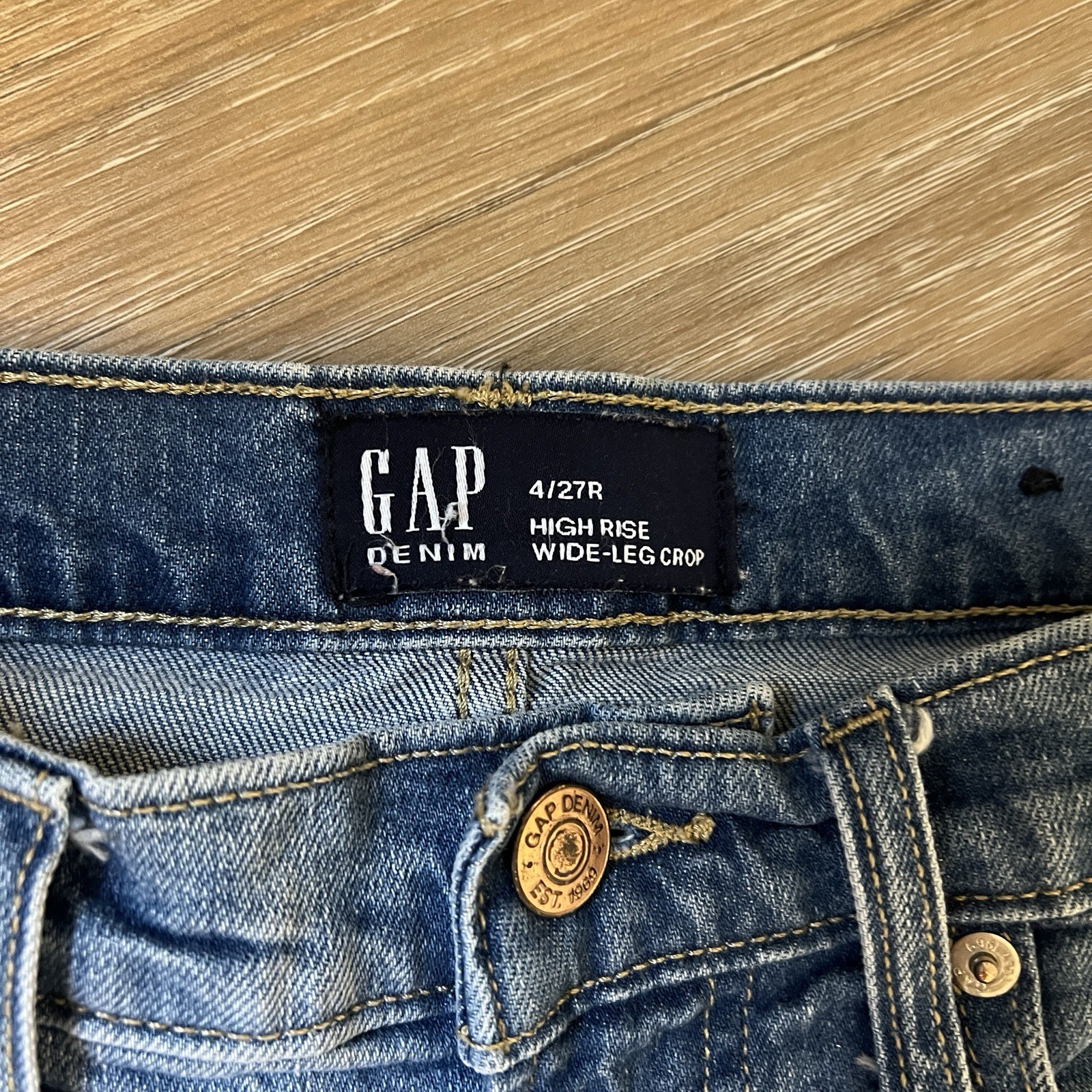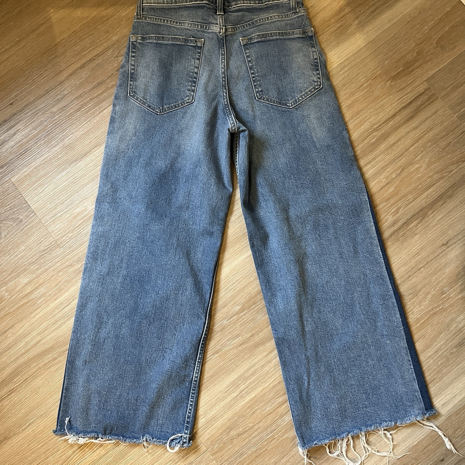 как выглядит GAP High Rise Wide Leg Crop Two-Tone Raw Hem Jeans Size 27 Denim Stretch фото
