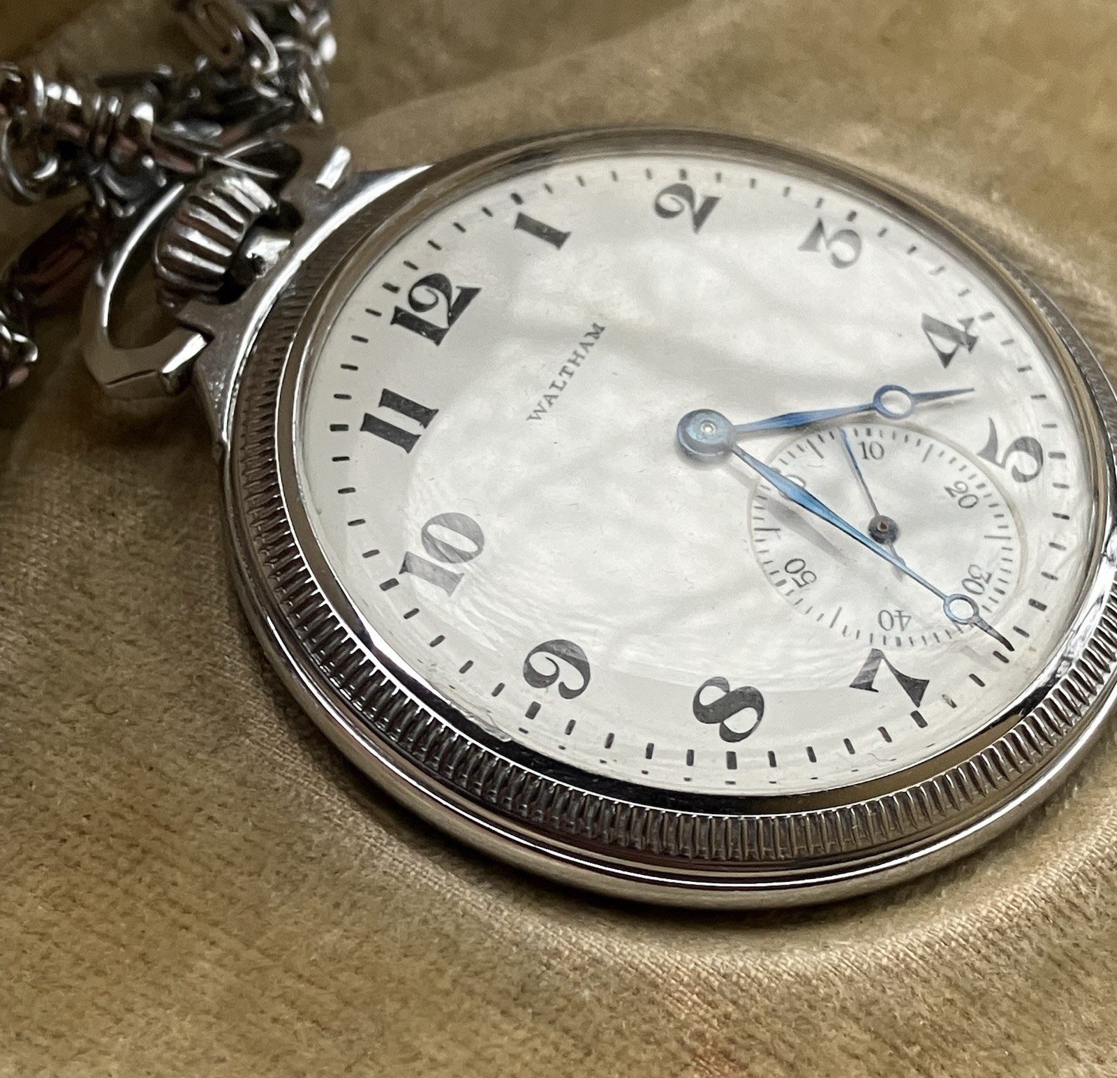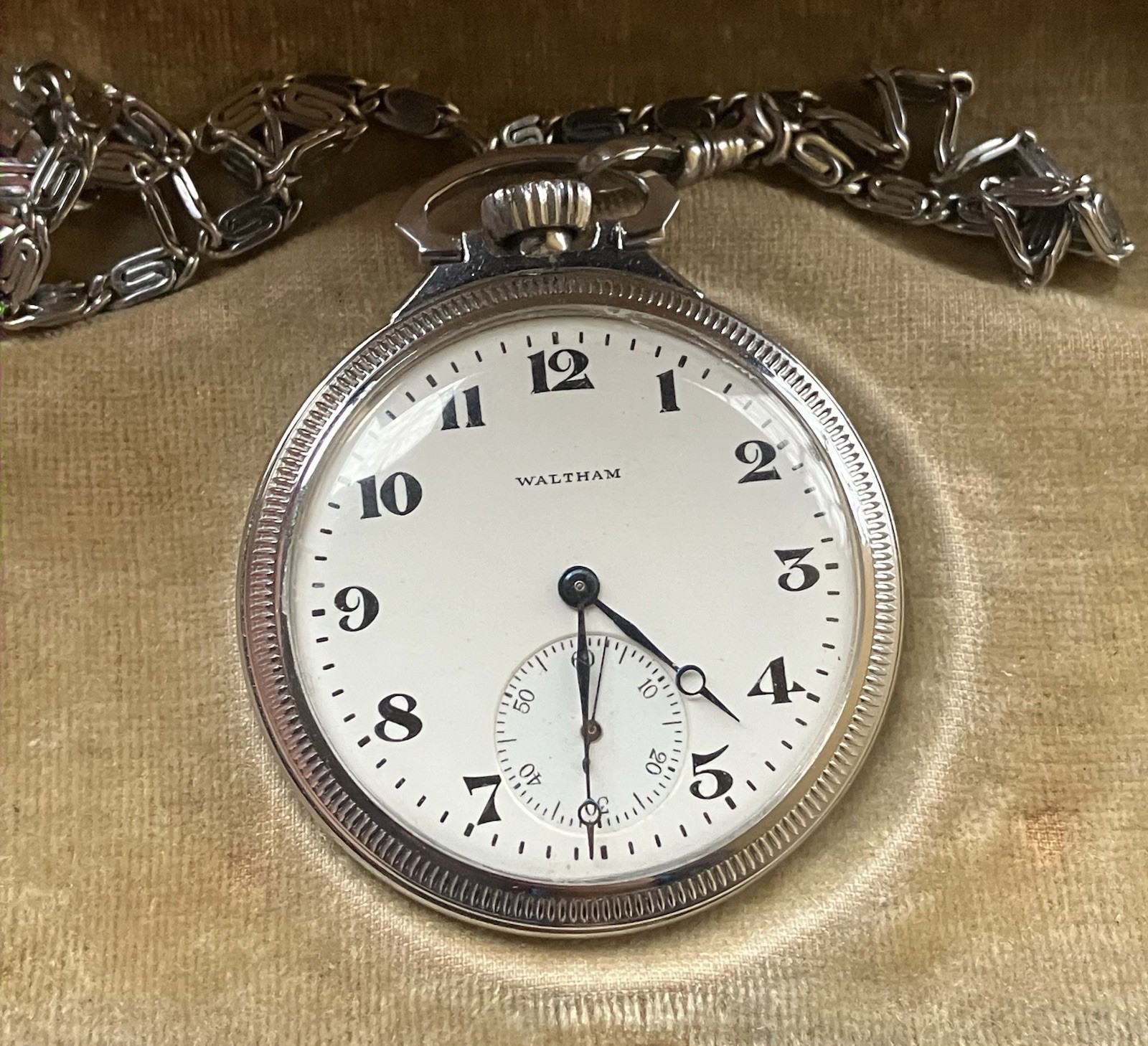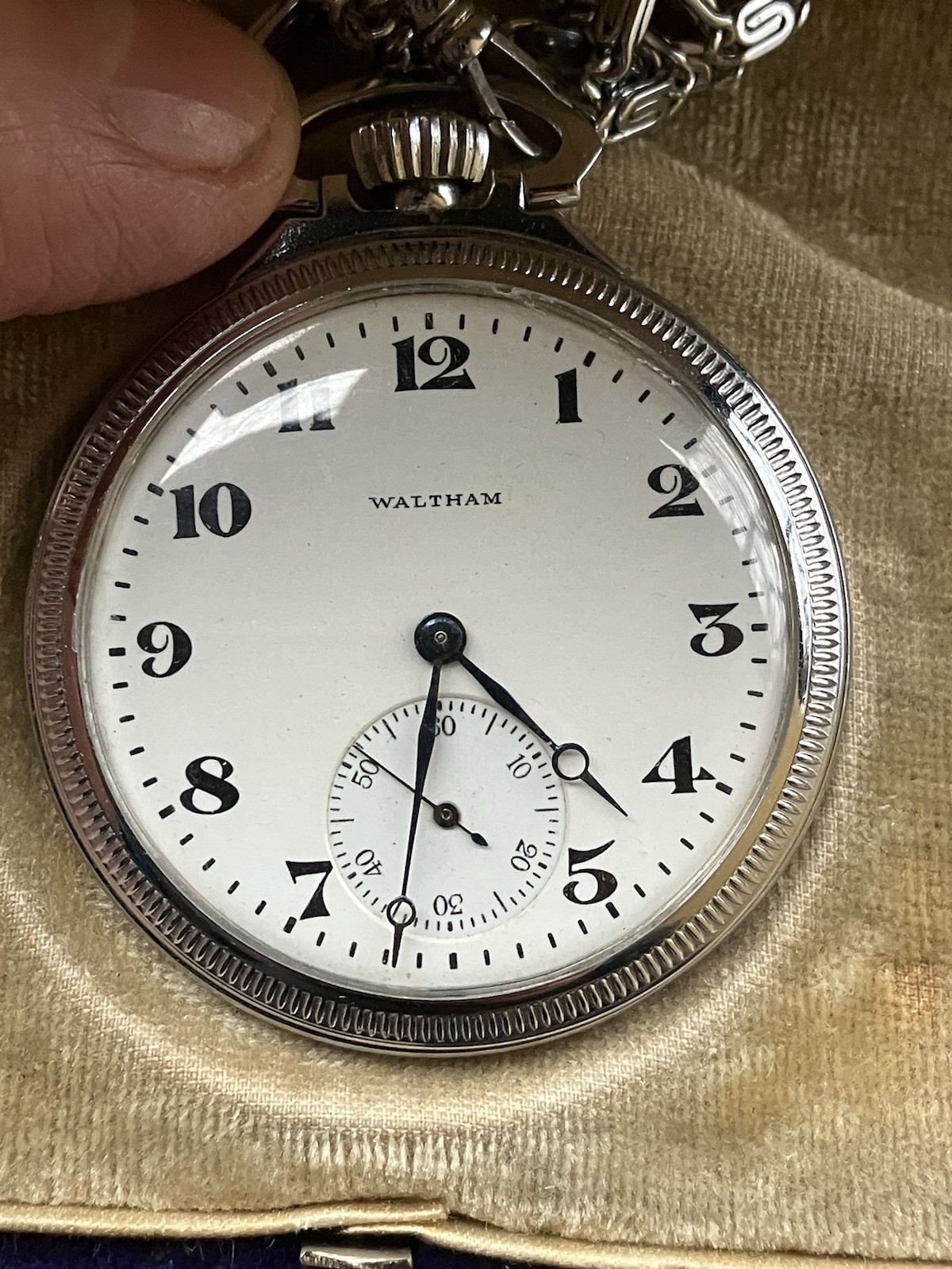 Waltham Nickel Chrome Antique Pocket Watch 7 Jewels 1916 With Chain Works
