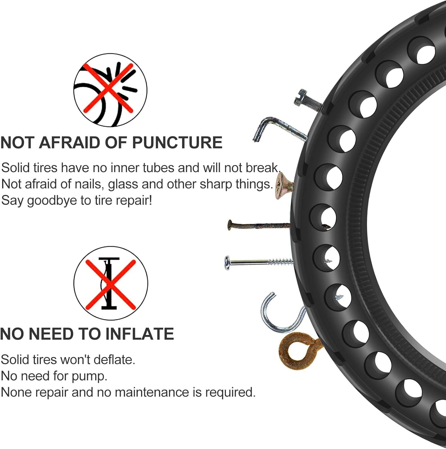 Особенности: Tubeless, Solid, Abrasion resistant, Scratch resistant, No inflation required, No patches needed, Heat resistant, Maintenance-free, High quality rubber material, Buffer pressure through special hollow design, Lightweight, Durable, Twice as hard as ordinary tires