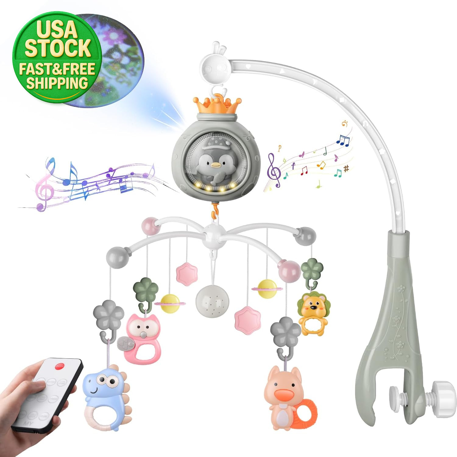 Crib Mobile Music Lights Baby Nursery Arm Hanger Portable Musical Hanging Toy