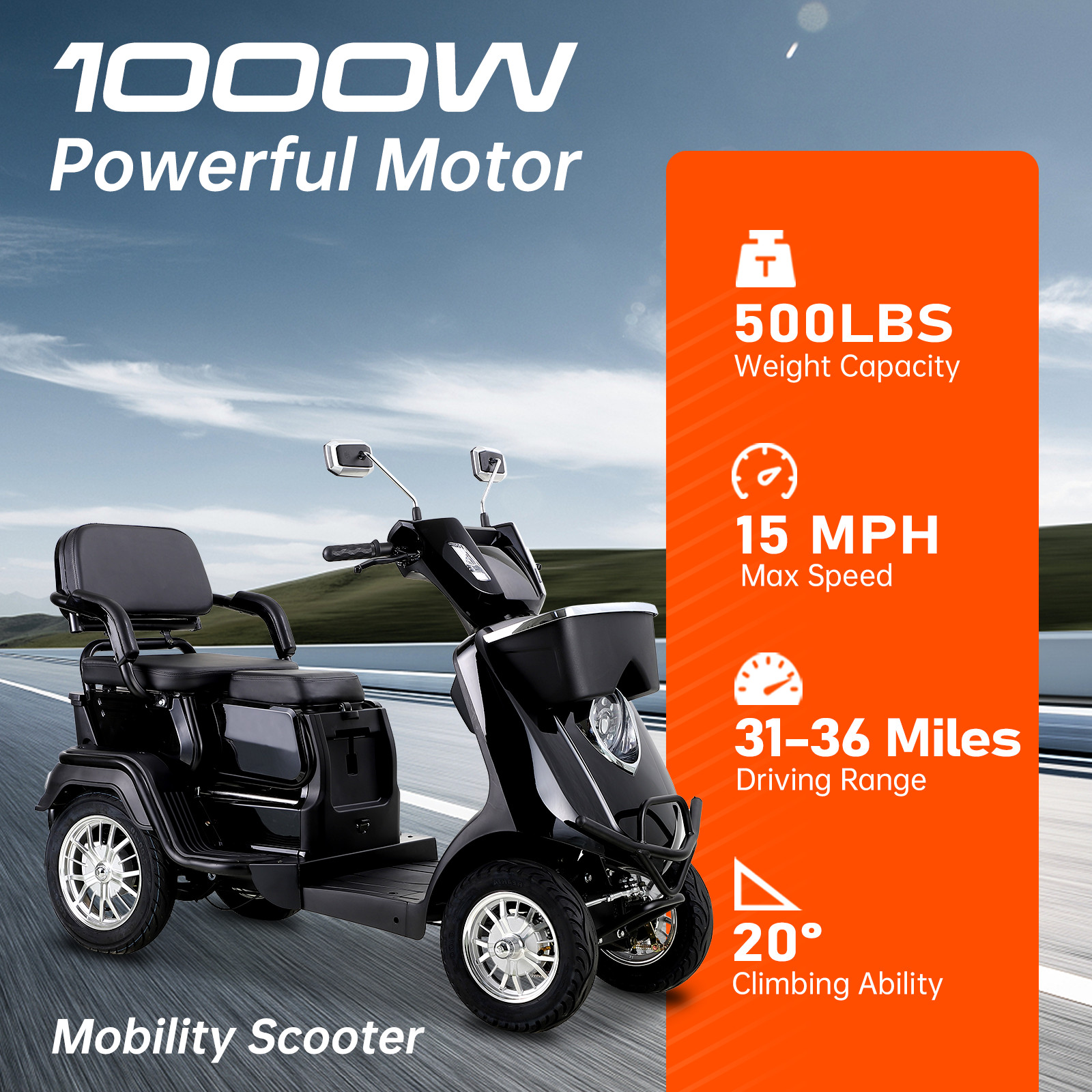 1000W 4-Wheel Heavy Duty 2-Seater Mobility Scooter for Seniors 500lbs 36 miles