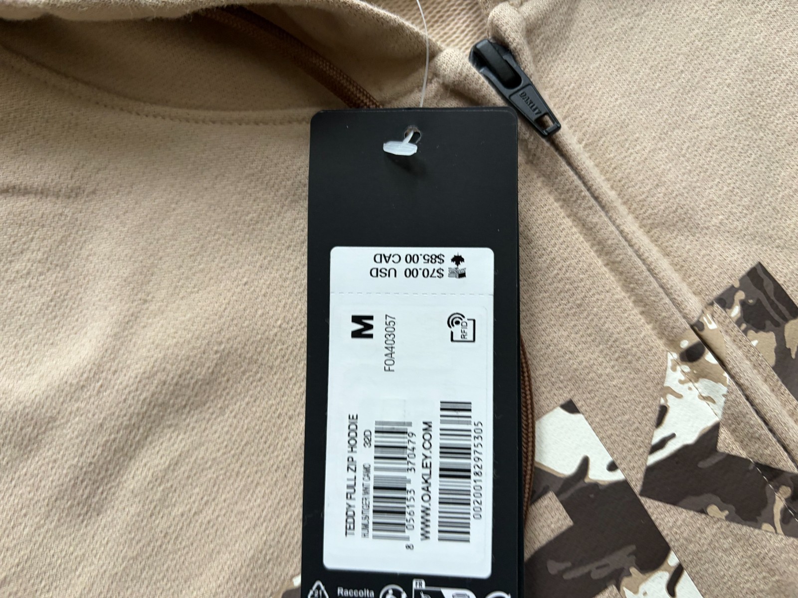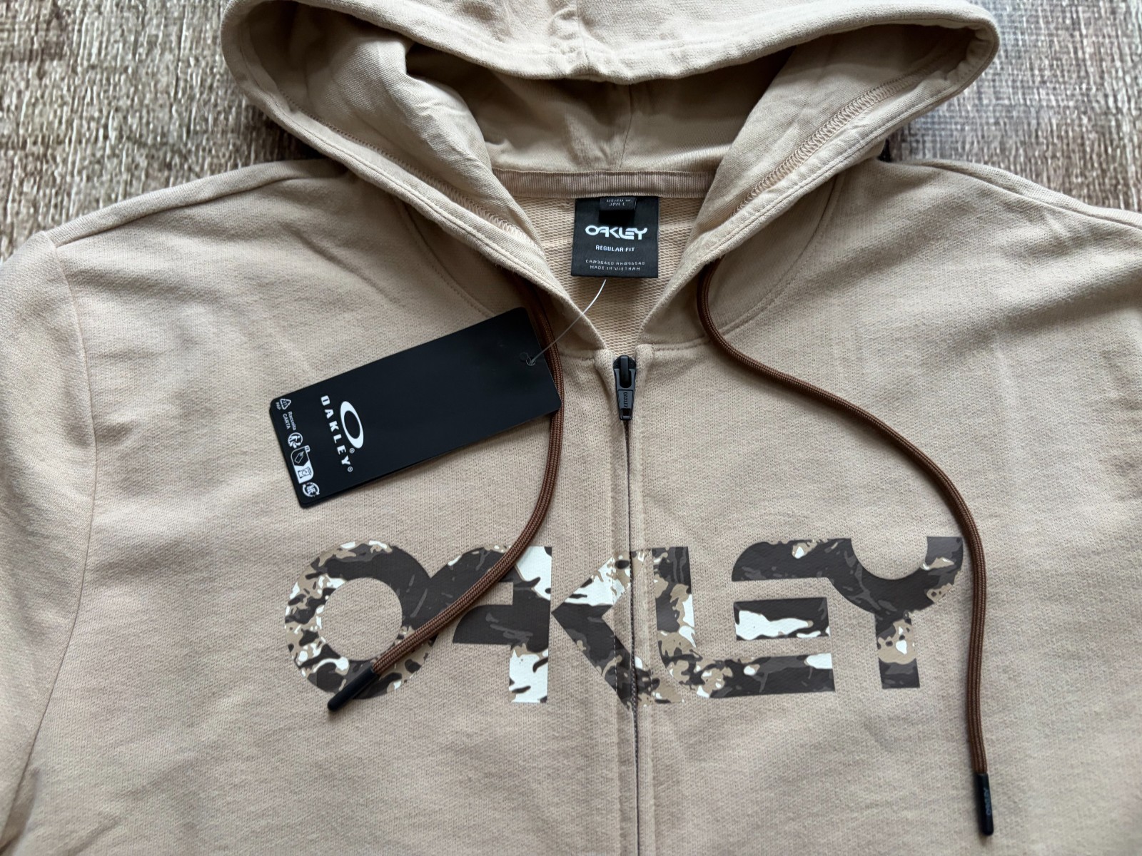 как выглядит OAKLEY REGULAR FIT TEDDY FULL ZIP HOODIE BEIGE CAMO MENS MEDIUM NEW WITH TAGS фото